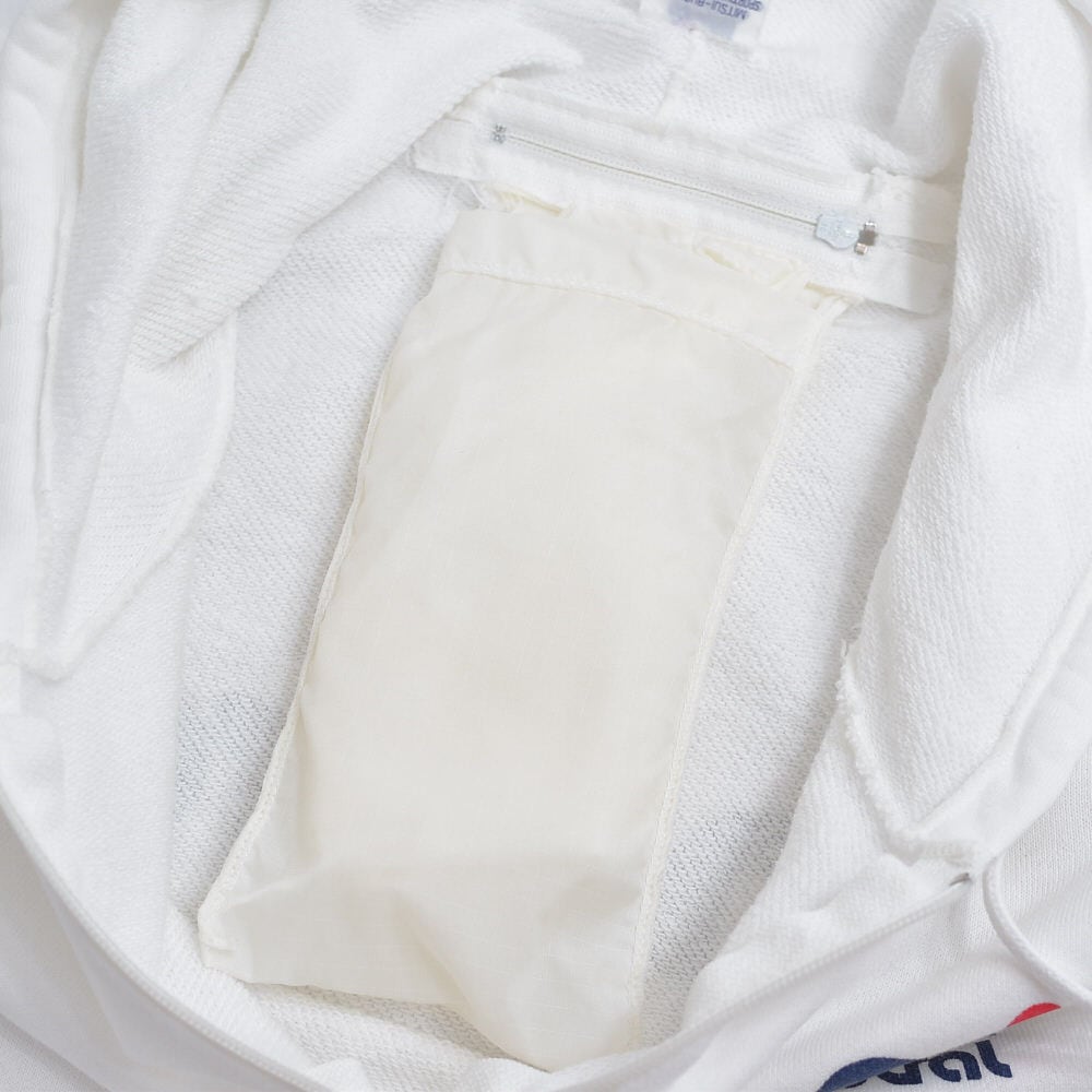 ・使用感や、軽い毛羽立ち、袖や裾リブの軽いヨレ、画像のようにナイロンのカンガルーポケットの端に小さな汚れなどはありますが、その他目立つ汚れ、ダメージは見当たらず、日常的に古着を着用されている方であれば、問題無く着用して頂けると思います