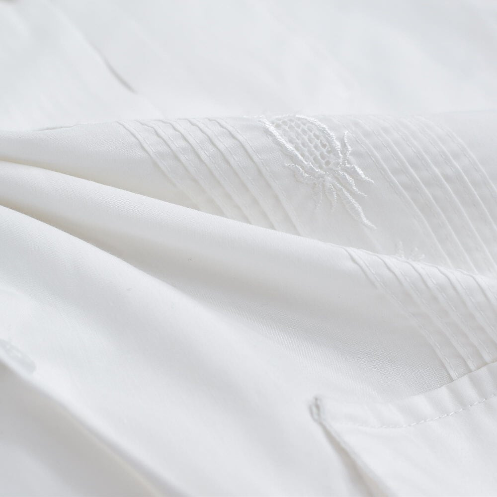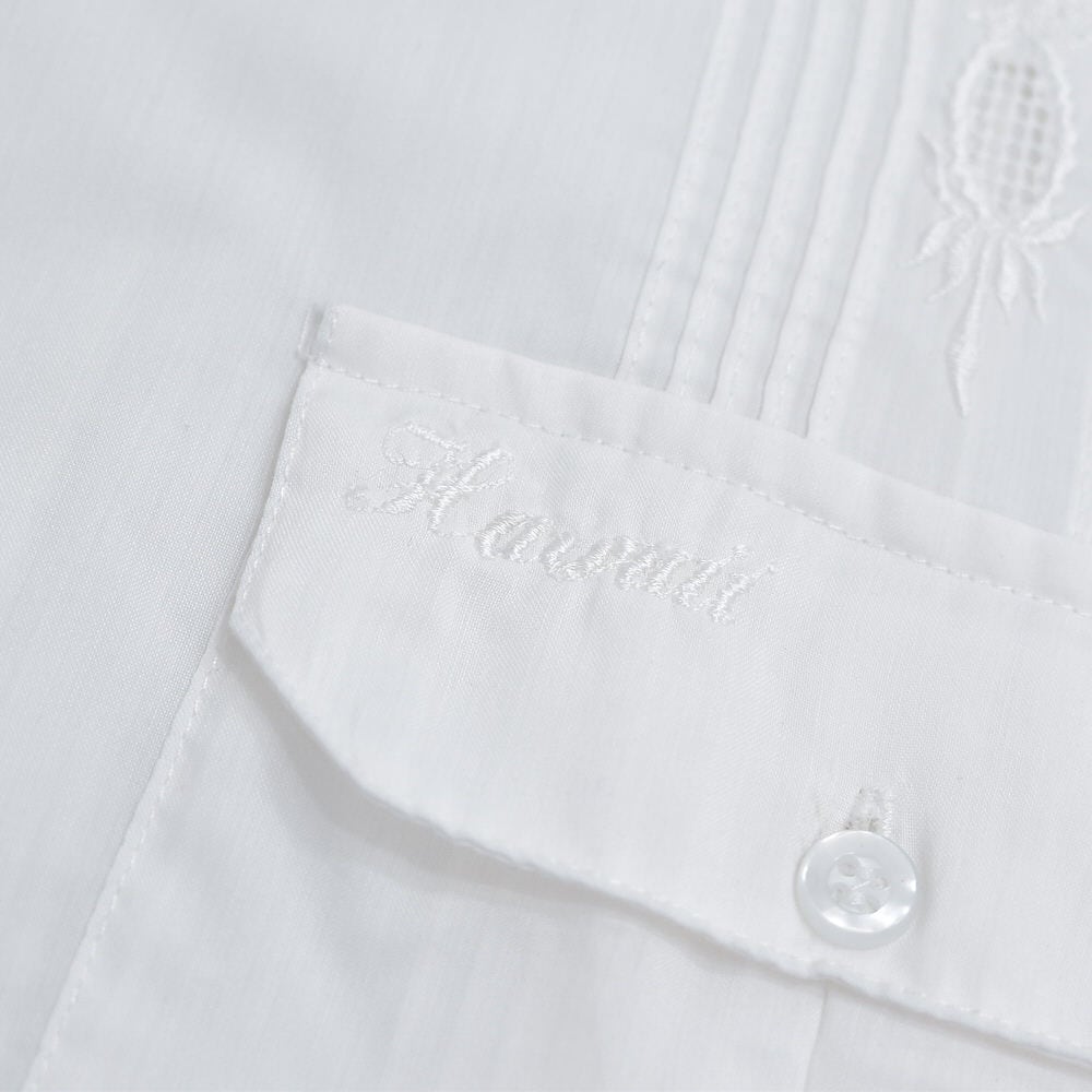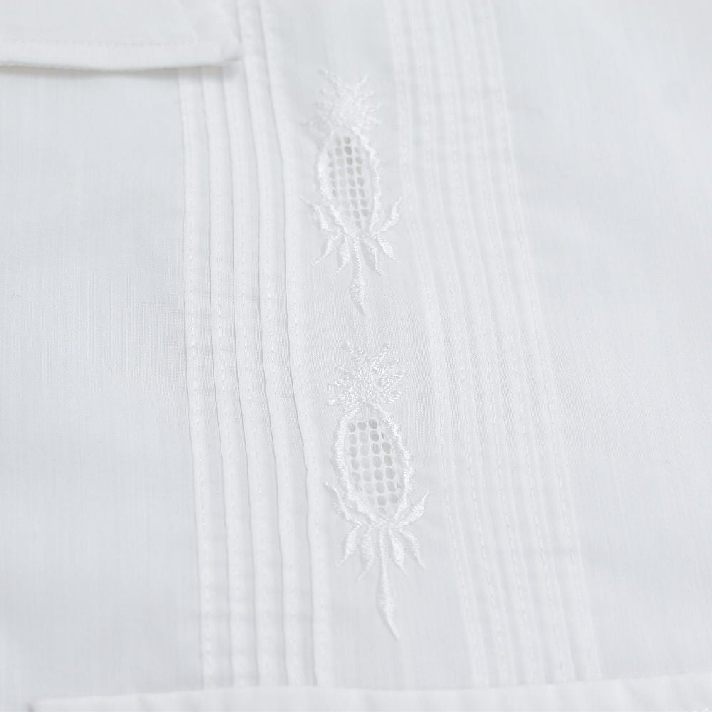 ピンタックが作る端正なストライプ模様に、突如として現れるパイナップルの刺繍が、見る人に笑顔を与えてくれそうです