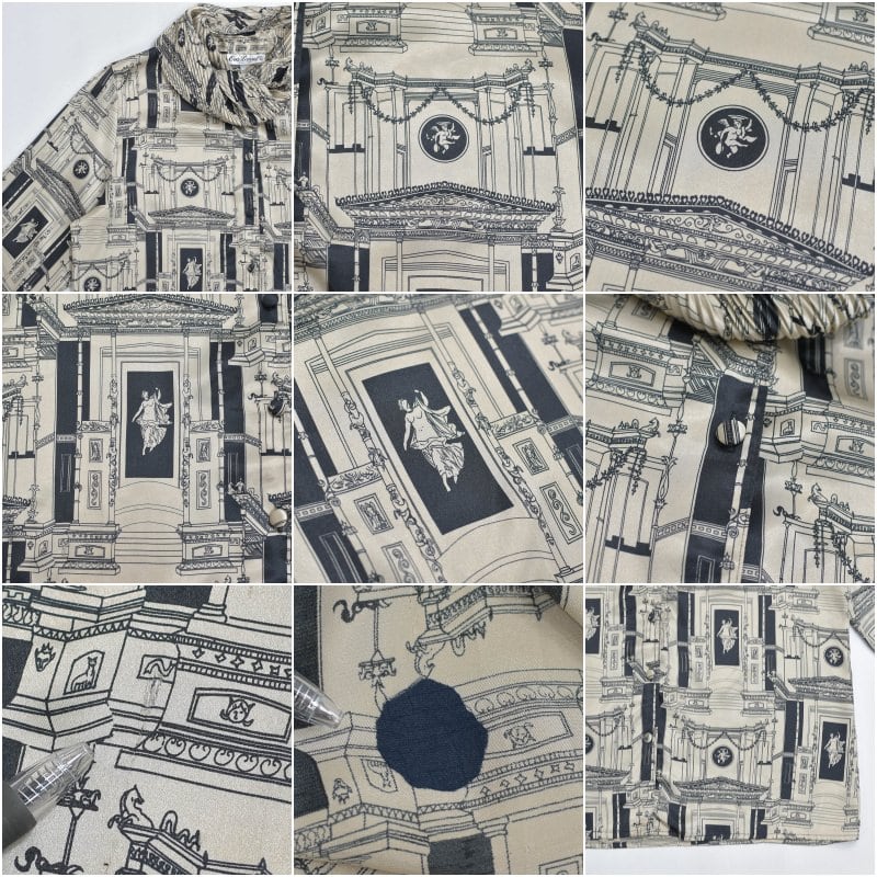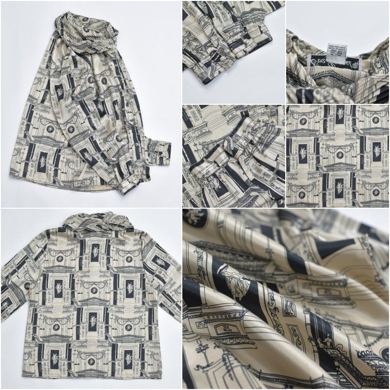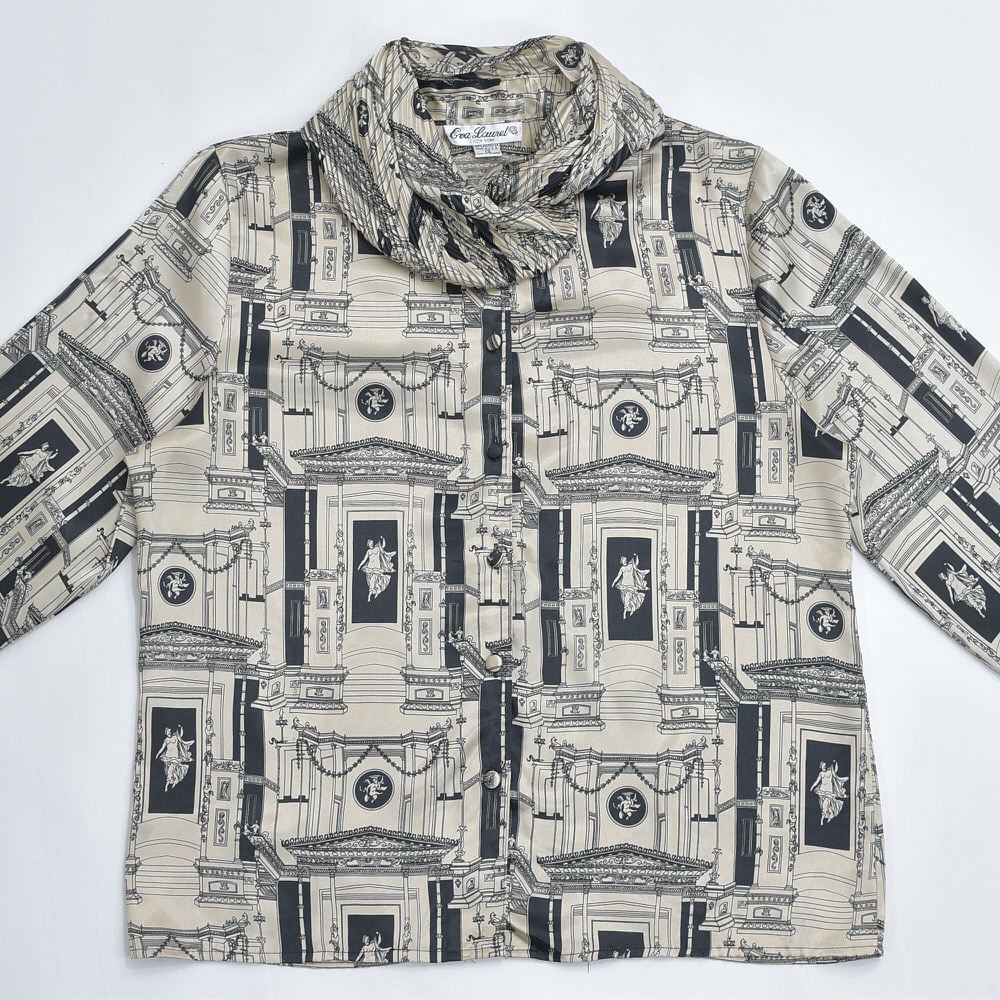 80〜90s USA製 Eva Laurel エヴァローレル 変形 ピローカラー アンティーク調 アートデザイン 総柄 ブラウス ポリエステル ヴィンテージ ビンテージ アメリカ古着 レディースL相当