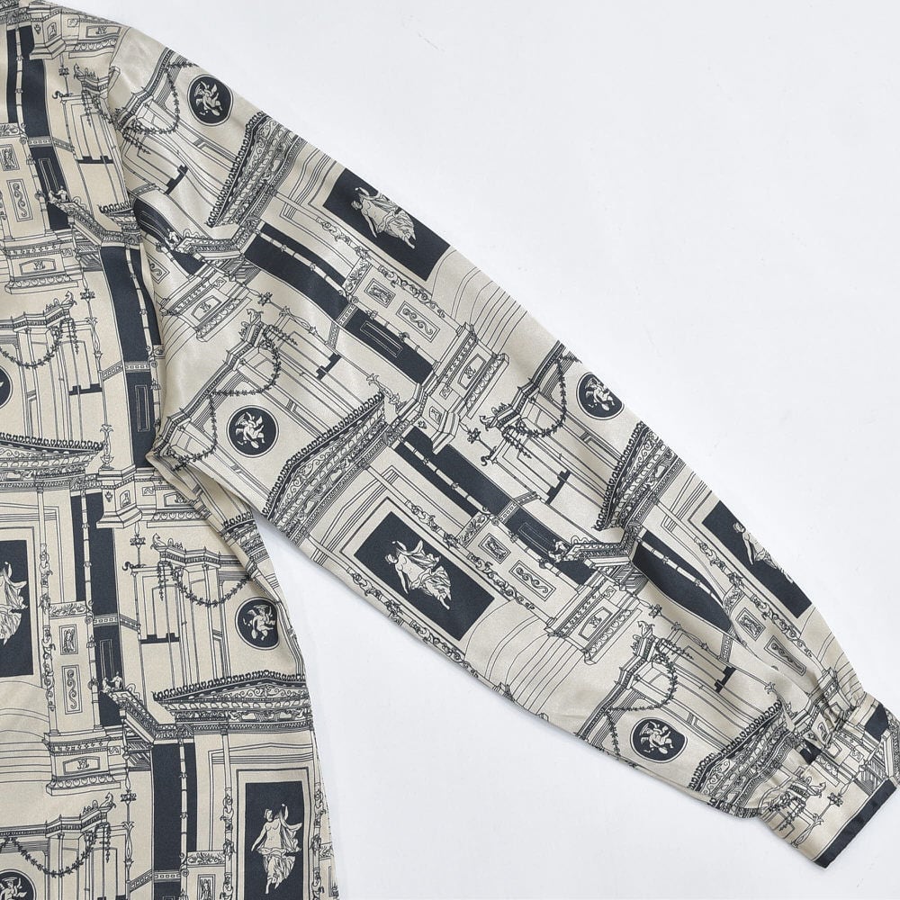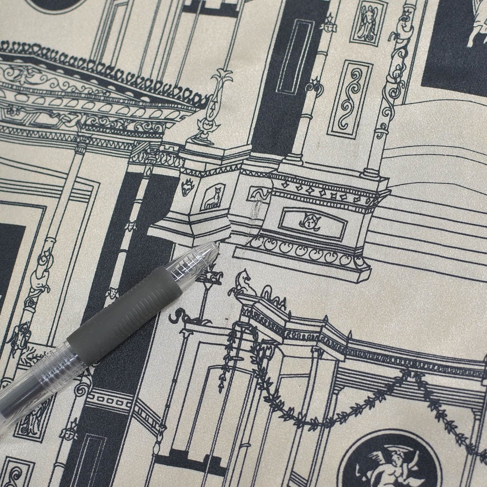 滑らかなポリエステルの生地をキャンバスに静かに佇む女神像や、荘厳な神殿の柱がモノトーンの世界で躍動します