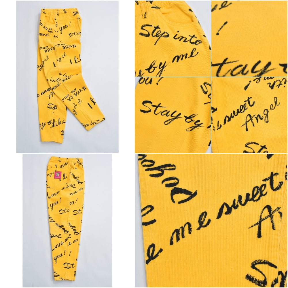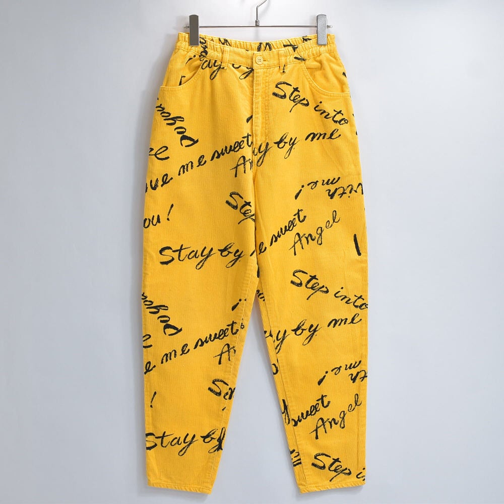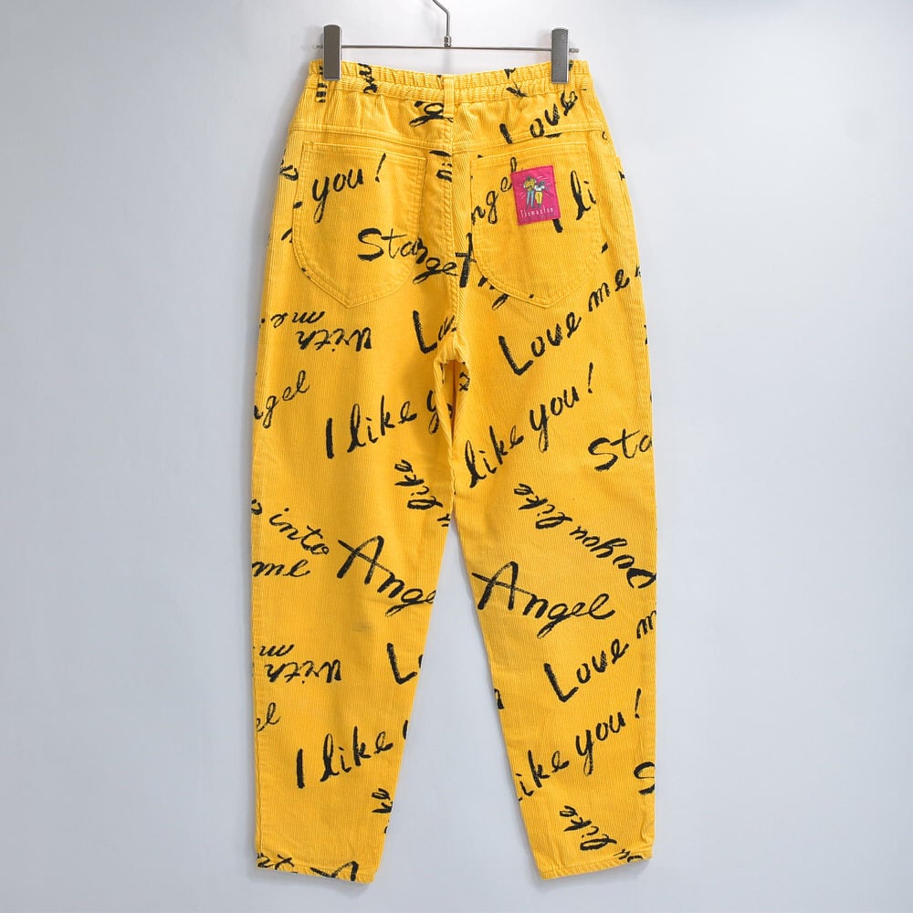 80s Thomaston トーマストン メッセージ 総柄 プリント デザイン コーデュロイ テーパードパンツ ボトムス 細コール パズル ジャパンヴィンテージ ビンテージ 古着 レディースW66~73cm