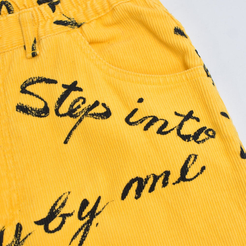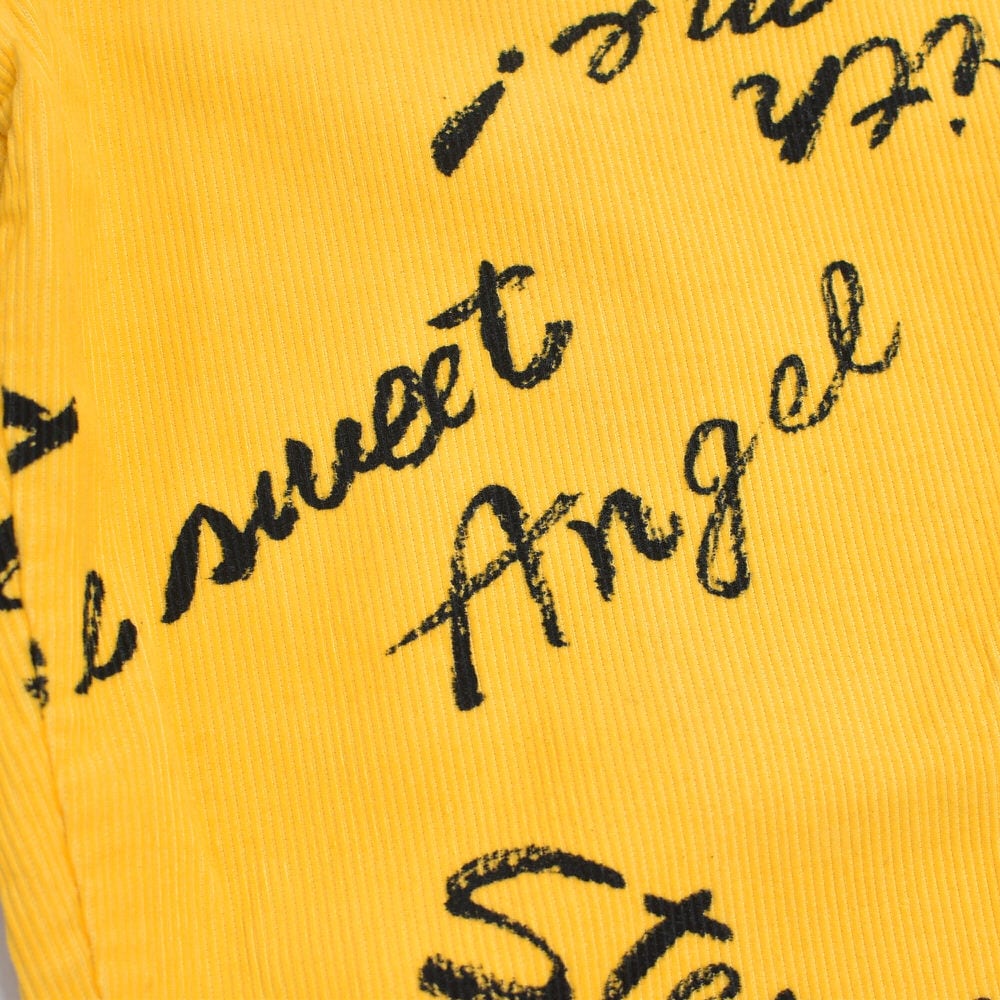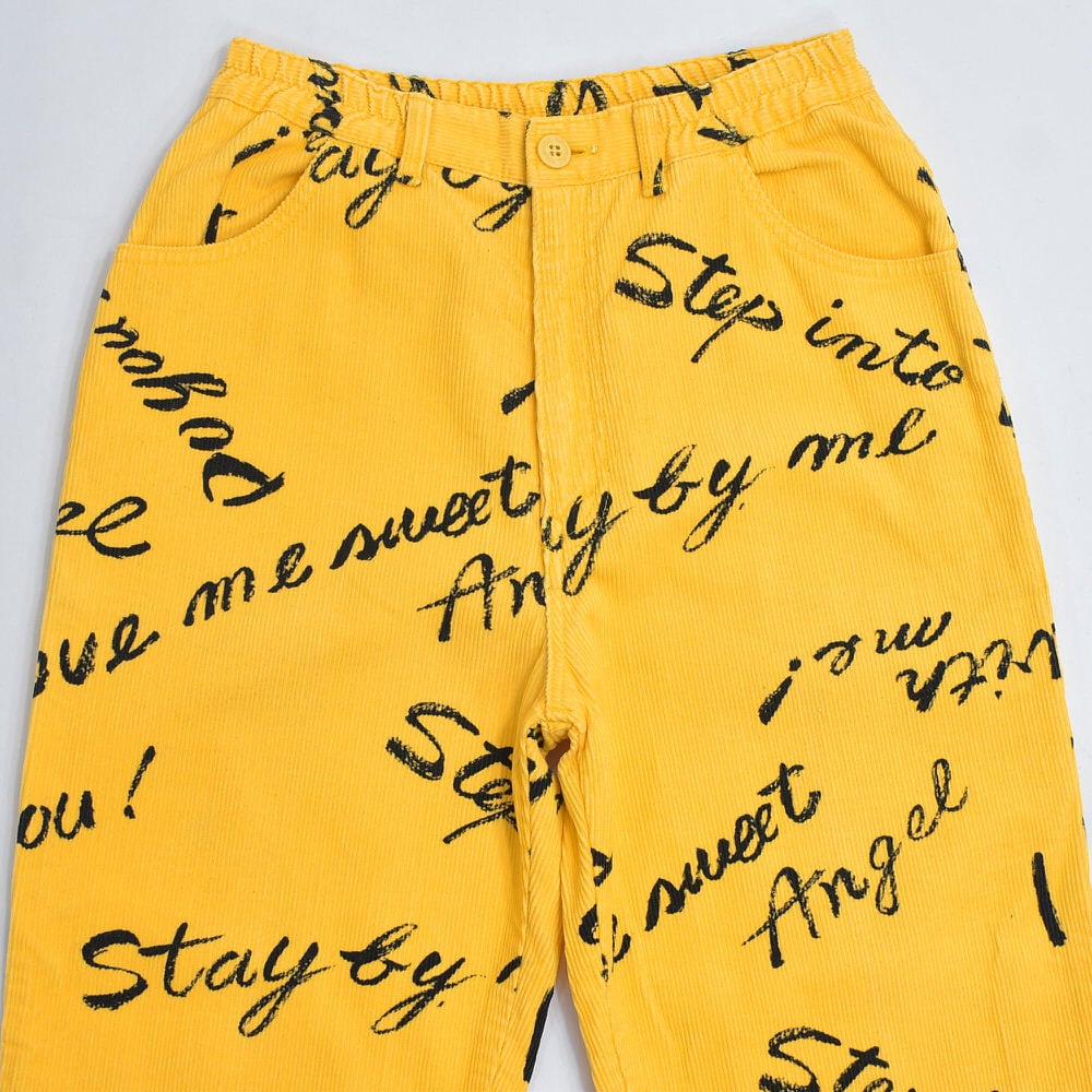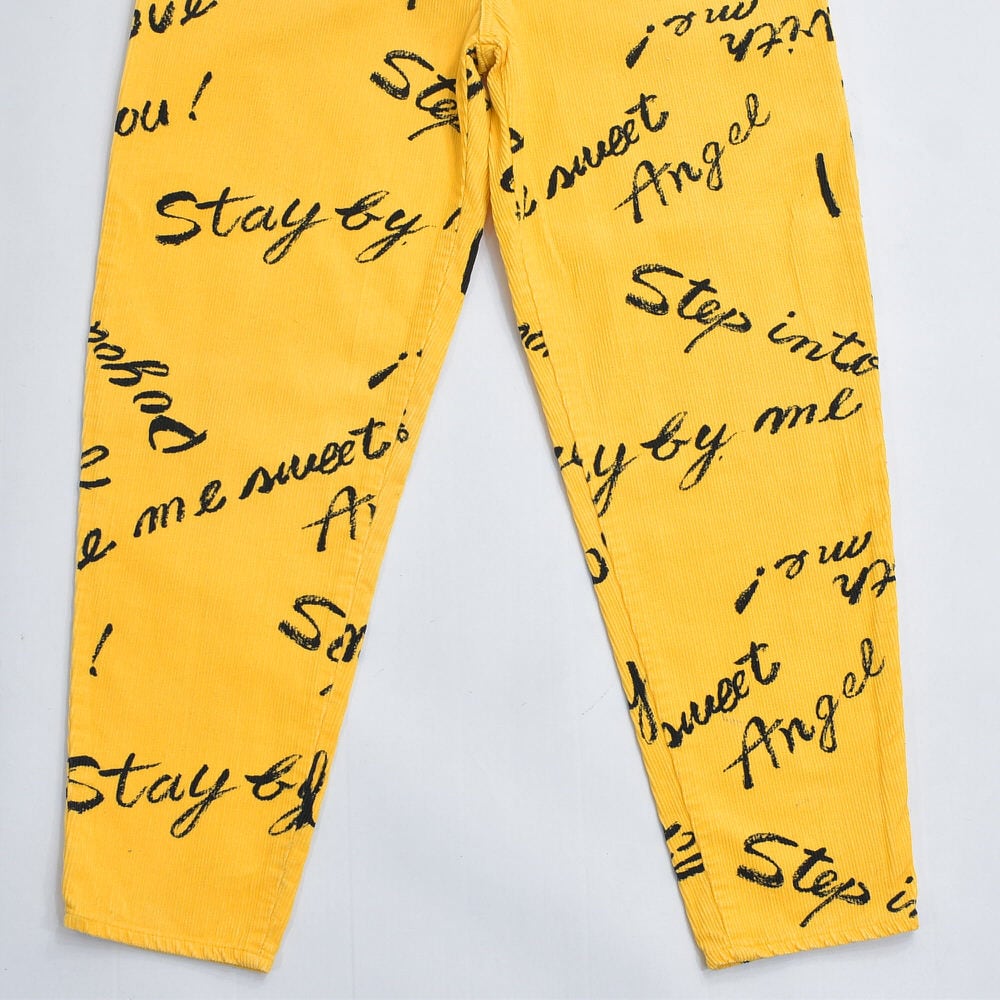 80s Thomaston トーマストン メッセージ 総柄 プリント デザイン コーデュロイ テーパードパンツ ボトムス 細コール パズル ジャパンヴィンテージ ビンテージ 古着 レディースW66~73cm