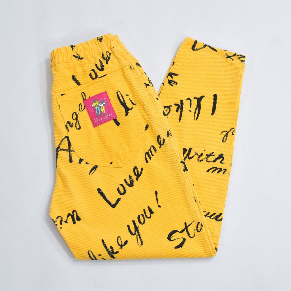 80s Thomaston トーマストン メッセージ 総柄 プリント デザイン コーデュロイ テーパードパンツ ボトムス 細コール パズル ジャパンヴィンテージ ビンテージ 古着 レディースW66〜73cm
