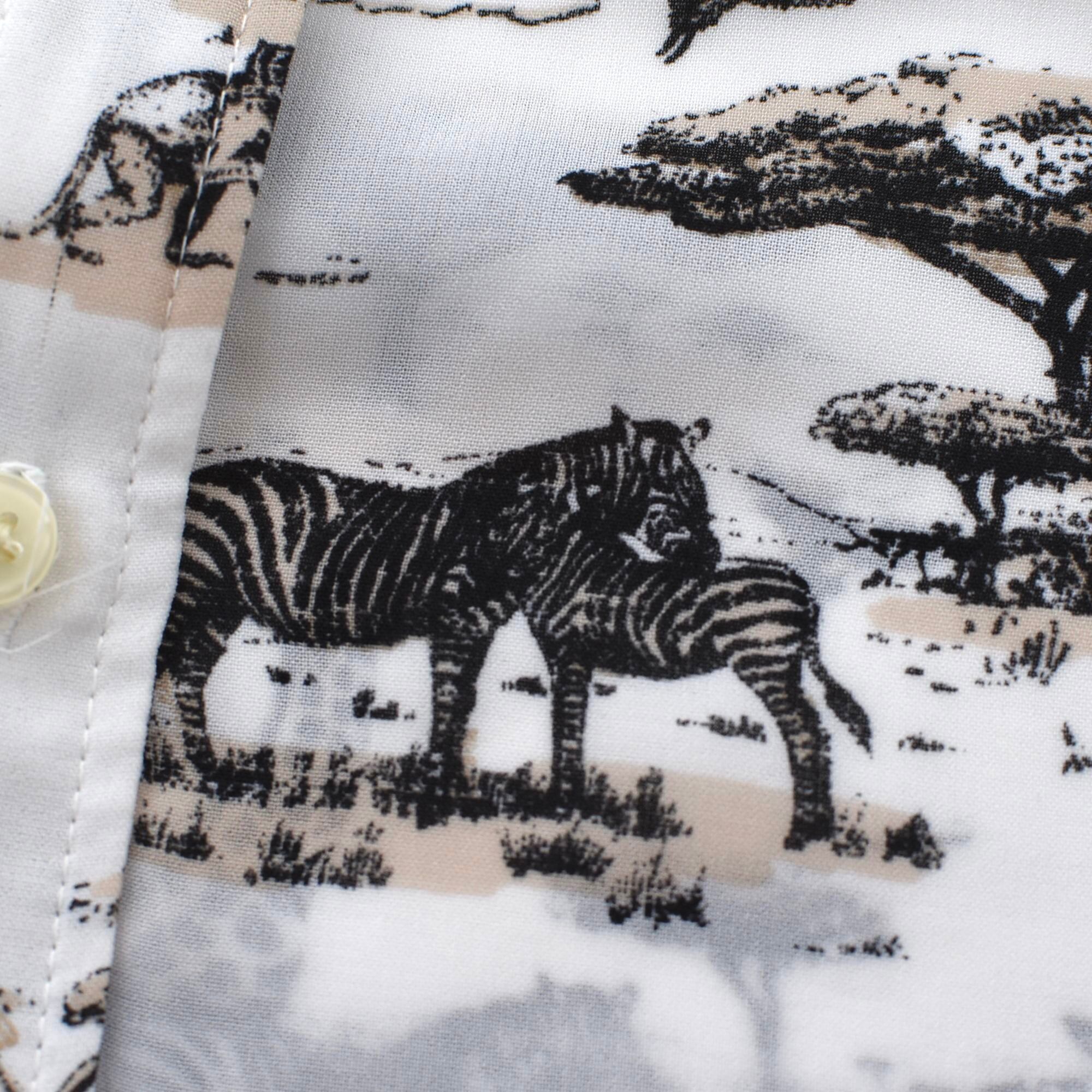 こちらはヴィンテージ ではありませんが、サファリ&トラベルを彷彿とさせる広大なサファリがホリゾンタルパターンでプリントされたシフォンシャツ
