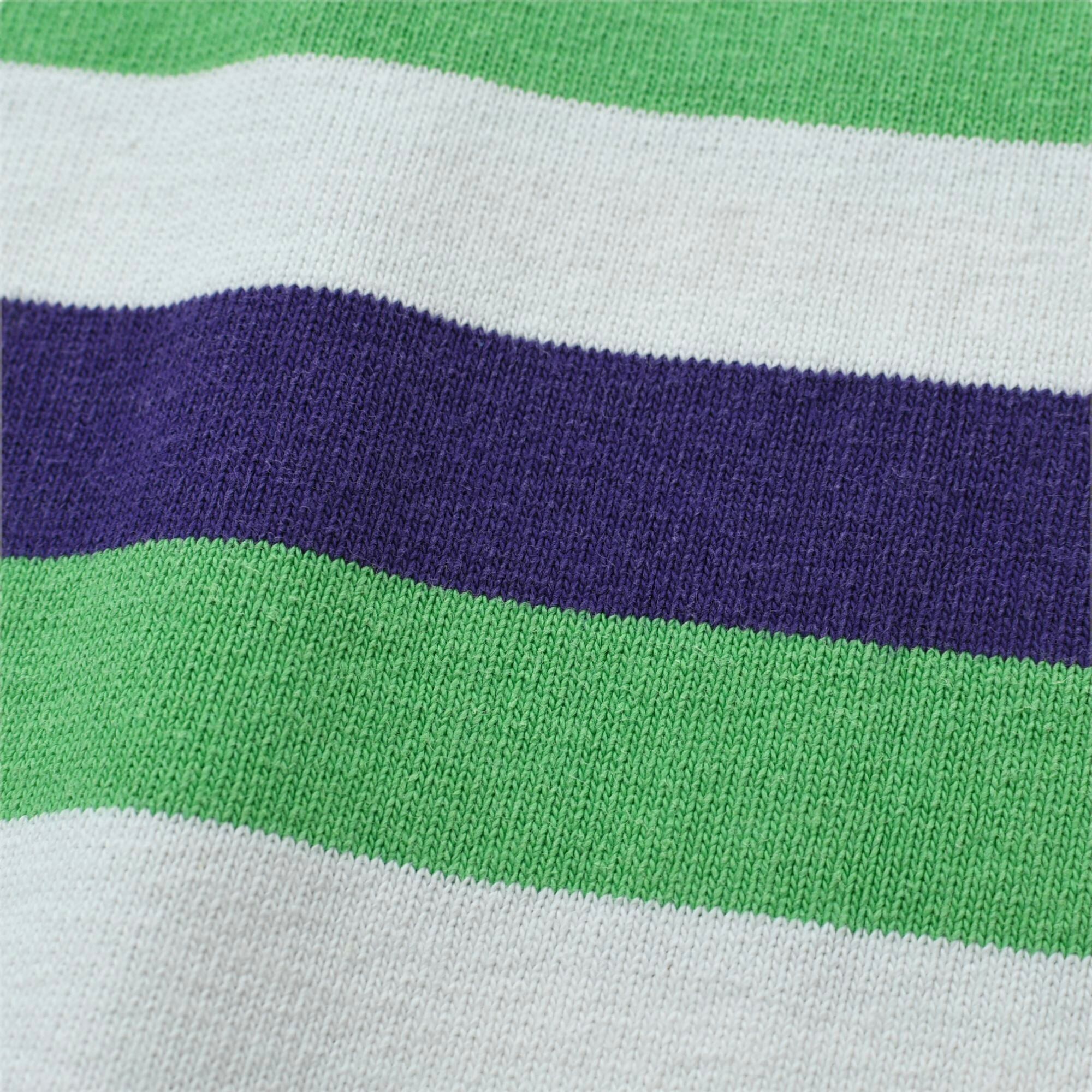 バスクシャツの様な厚手のコットン素材にパープル×ライトグリーン×ホワイトのマルチボーダーがセンスの良さを感じるカラーチョイスですね◎