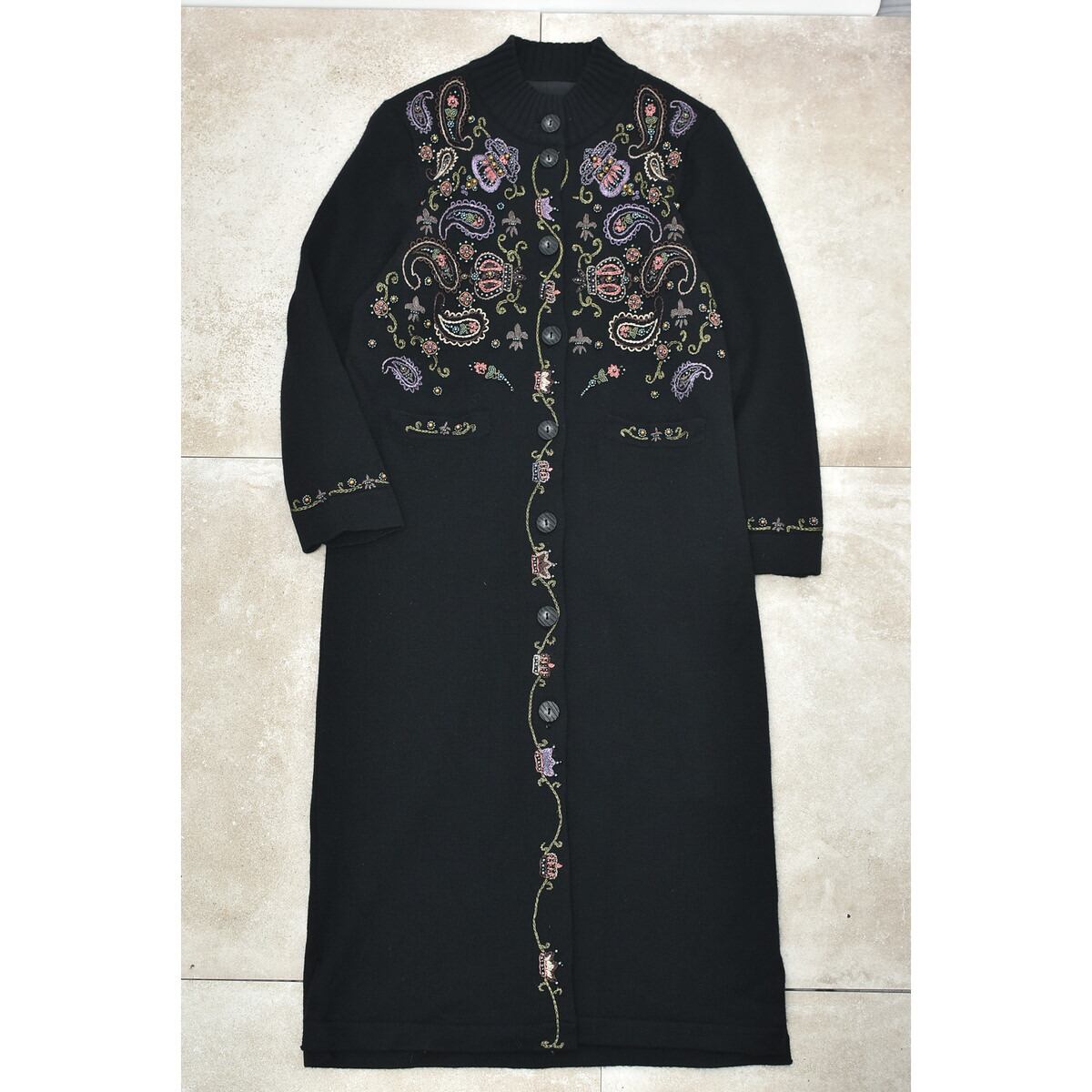 レディース L相当 ペイズリー ビーズ デコレーション デザイン ニット ロング コート アウター カーディガン スタンドネック 裏地付き ブラック