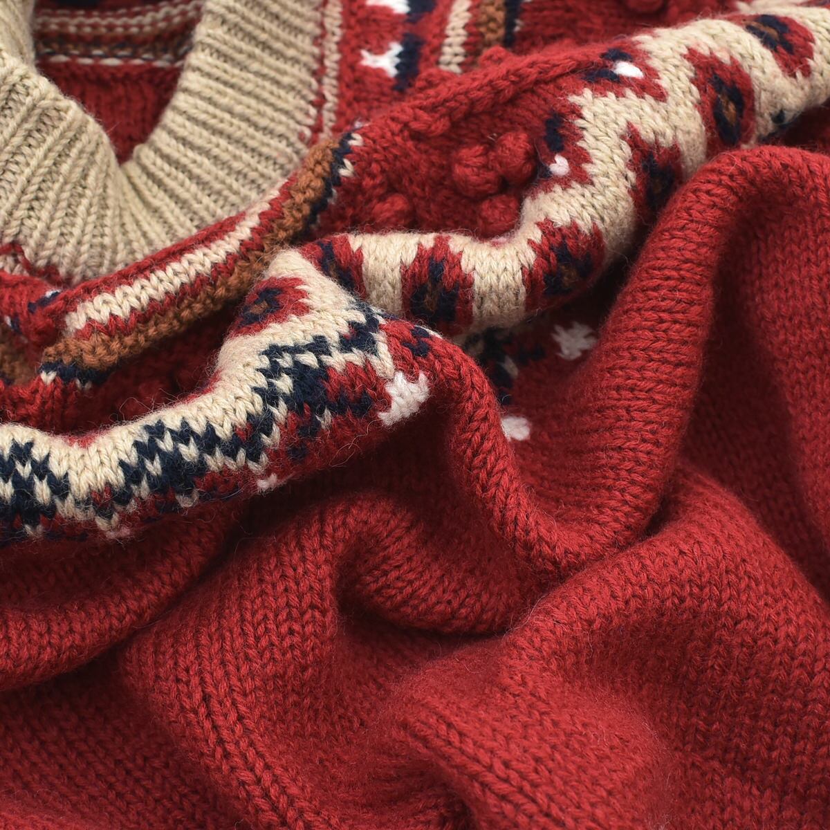 レディース L相当 ノルディック柄 ポンポンデザイン セーター ジャガード ニット モックネック 北欧 ウール えんじ色系 ダークレッド系