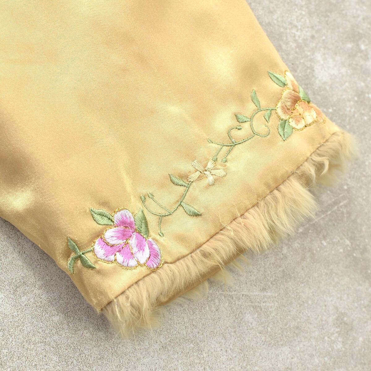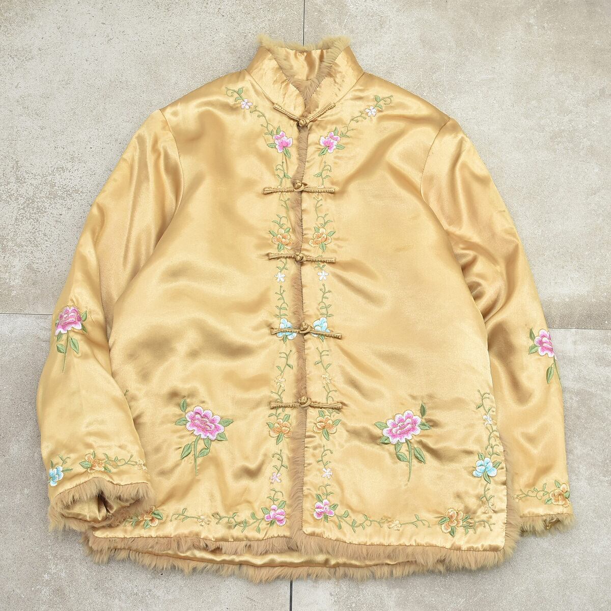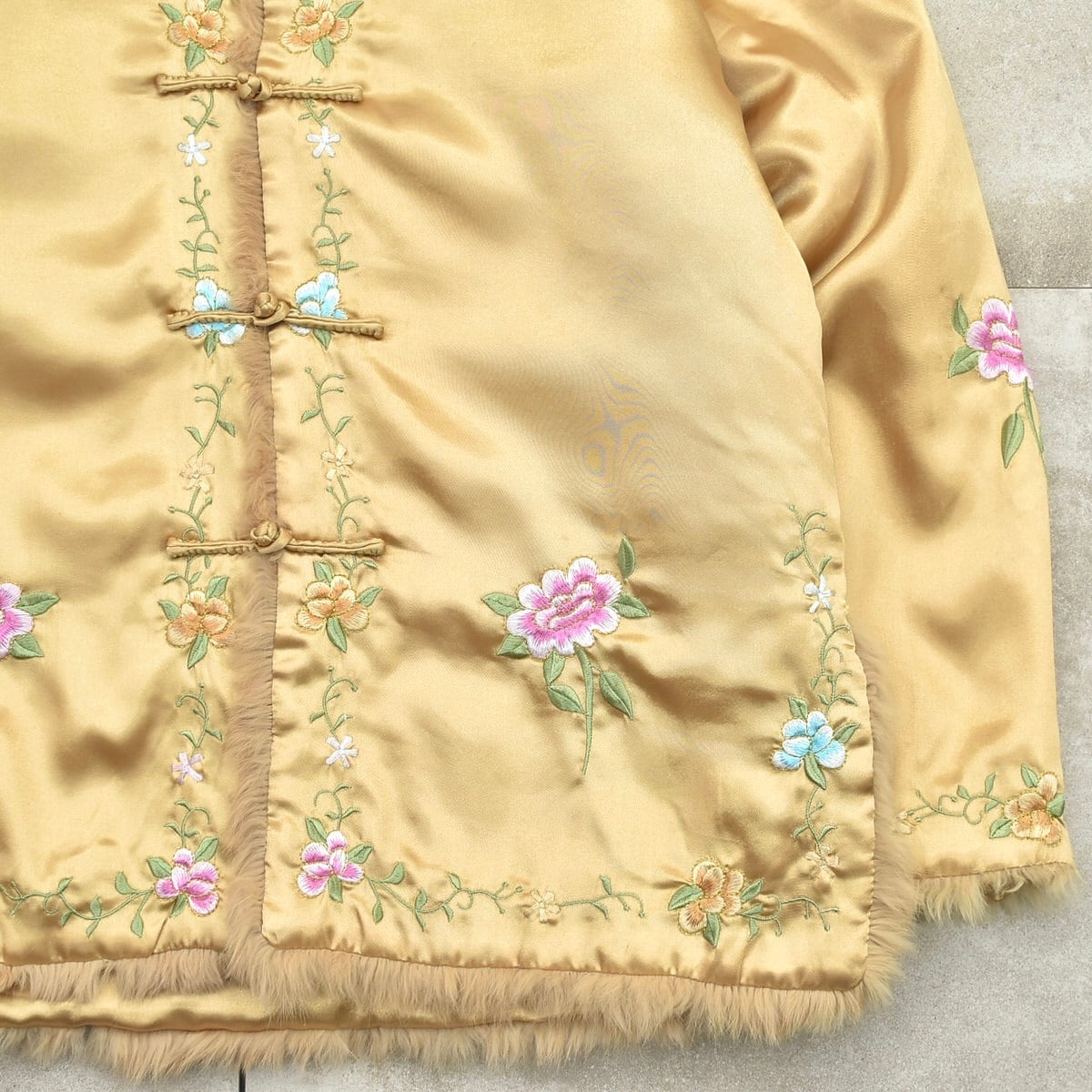 レディース L相当 刺繍 リアルファー デザイン サテン チャイナ シャツ ジャケット 中綿入り 光沢 中国 ゴールド系