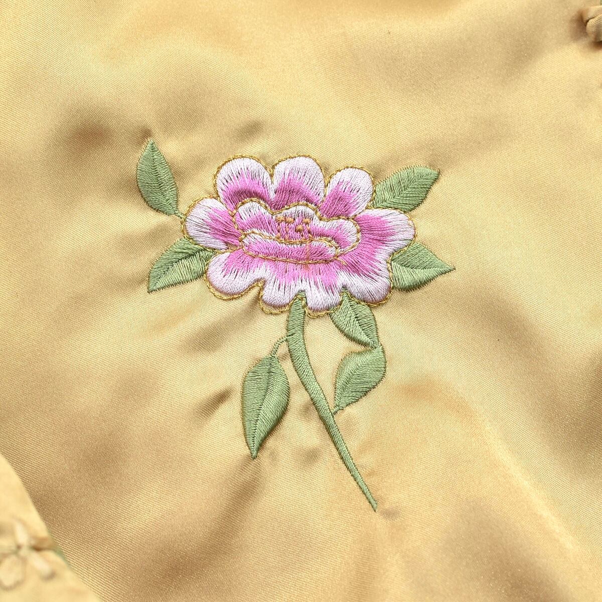 光沢のある煌びやかな素材に、ところ狭しお花の刺繍とファーのパイピングが施されたかなり手の込んだチャイナシャツジャケット