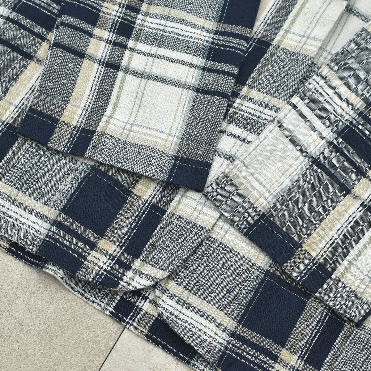 ジャガードで編み込まれたチェックパターンはネイビーやベージュラインを使い、落ち着いたトーンの爽やかさのある一枚