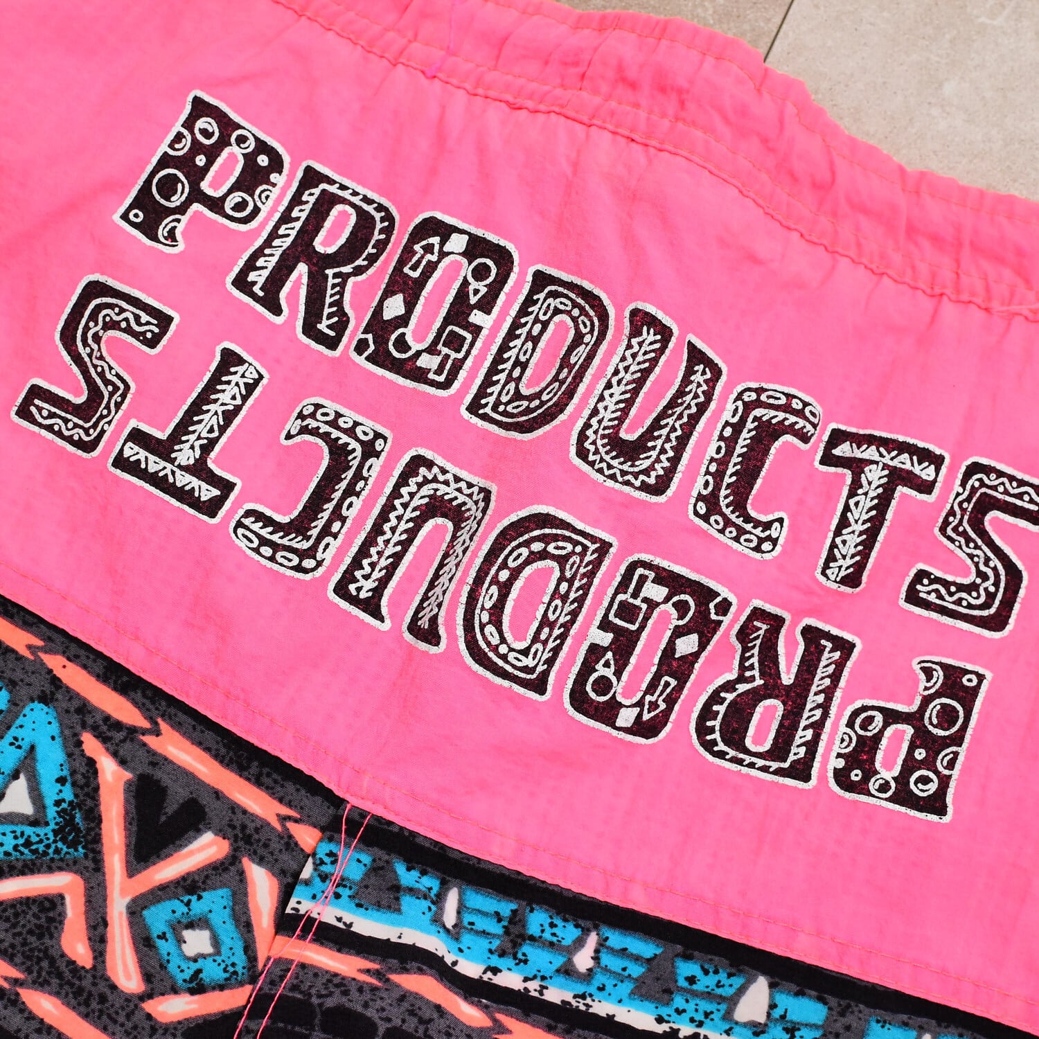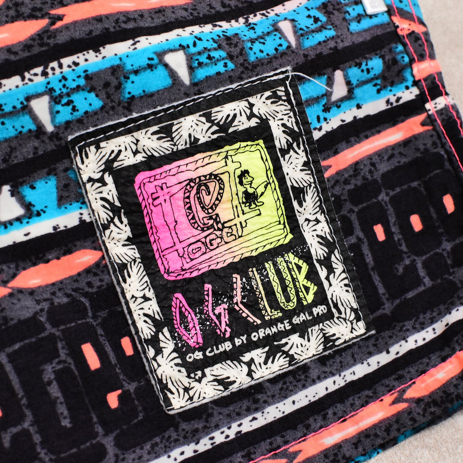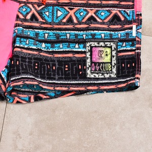 鮮やかなネオンピンクにポリネシアンなエスニック柄やロゴ、そしてネーム刺繍にお馴染みの原始人キャラ