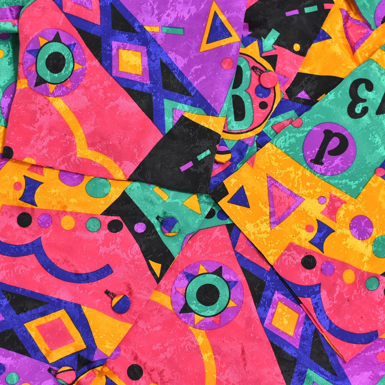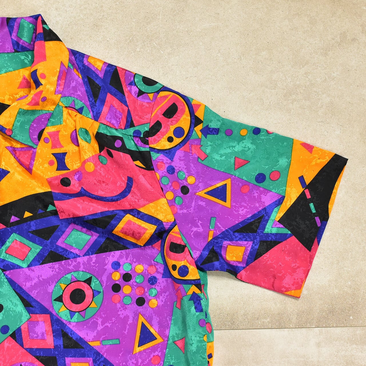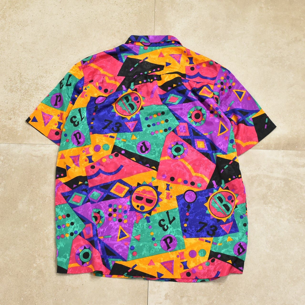 レディース L相当 ヴィンテージ ポップアート デザイン 総柄 開襟シャツ 半袖 幾何学模様 古着 カラフル Vtg Pop art design polyester shirt