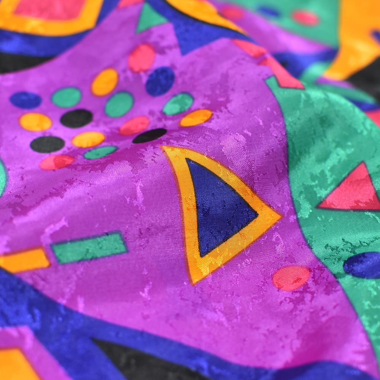 ショッキングピンク、パープル、オレンジ、ブラック、そしてグリーンなど発色の強いカラーを幾何学模様でデザインした現代アートを彷彿とさせる艶やかな一枚
