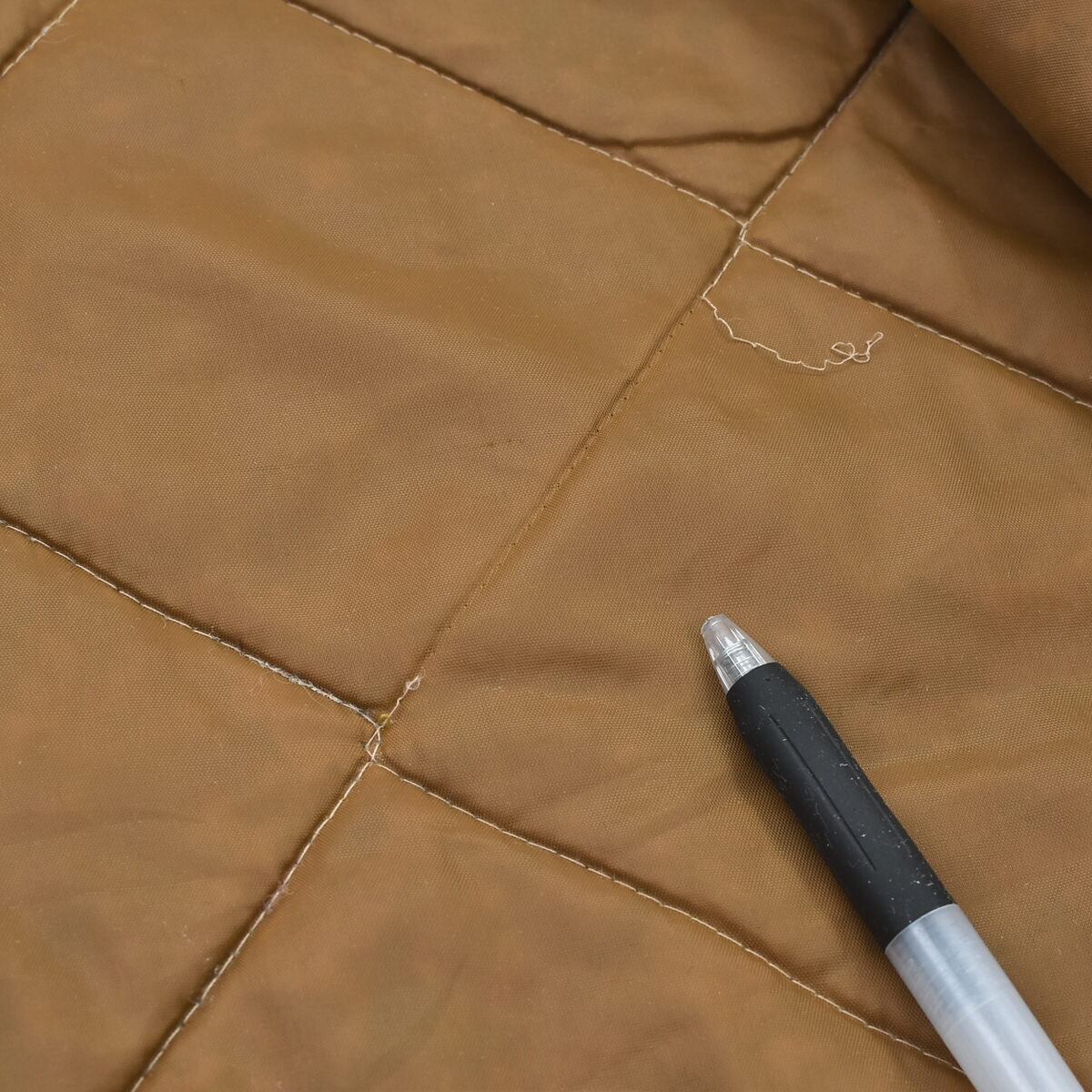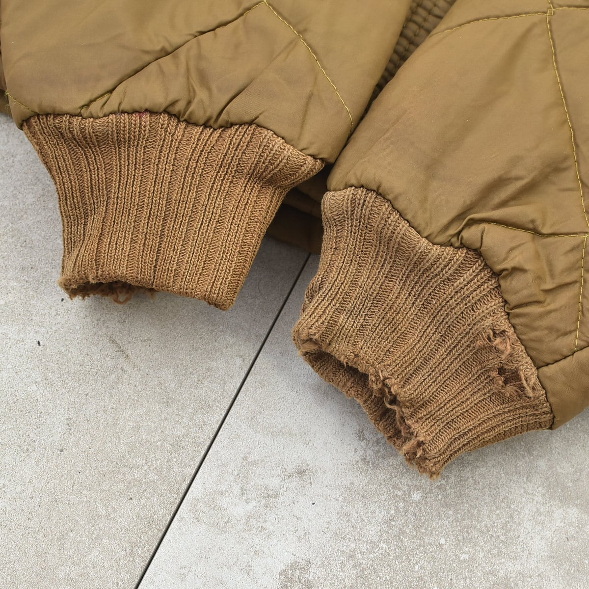 画像の様に、袖リブのダメージや表面の右肩、右脇、背中中央付近や、左脇、裏地などにキルティングのほつれや、ジップの一番下の付け根の軽いほつれ(ジップは問題なく開閉出来ます)などありますが、目立つ汚れ、などは無く、ヴィンテージ の雰囲気としてお楽しみ頂けるかなと。