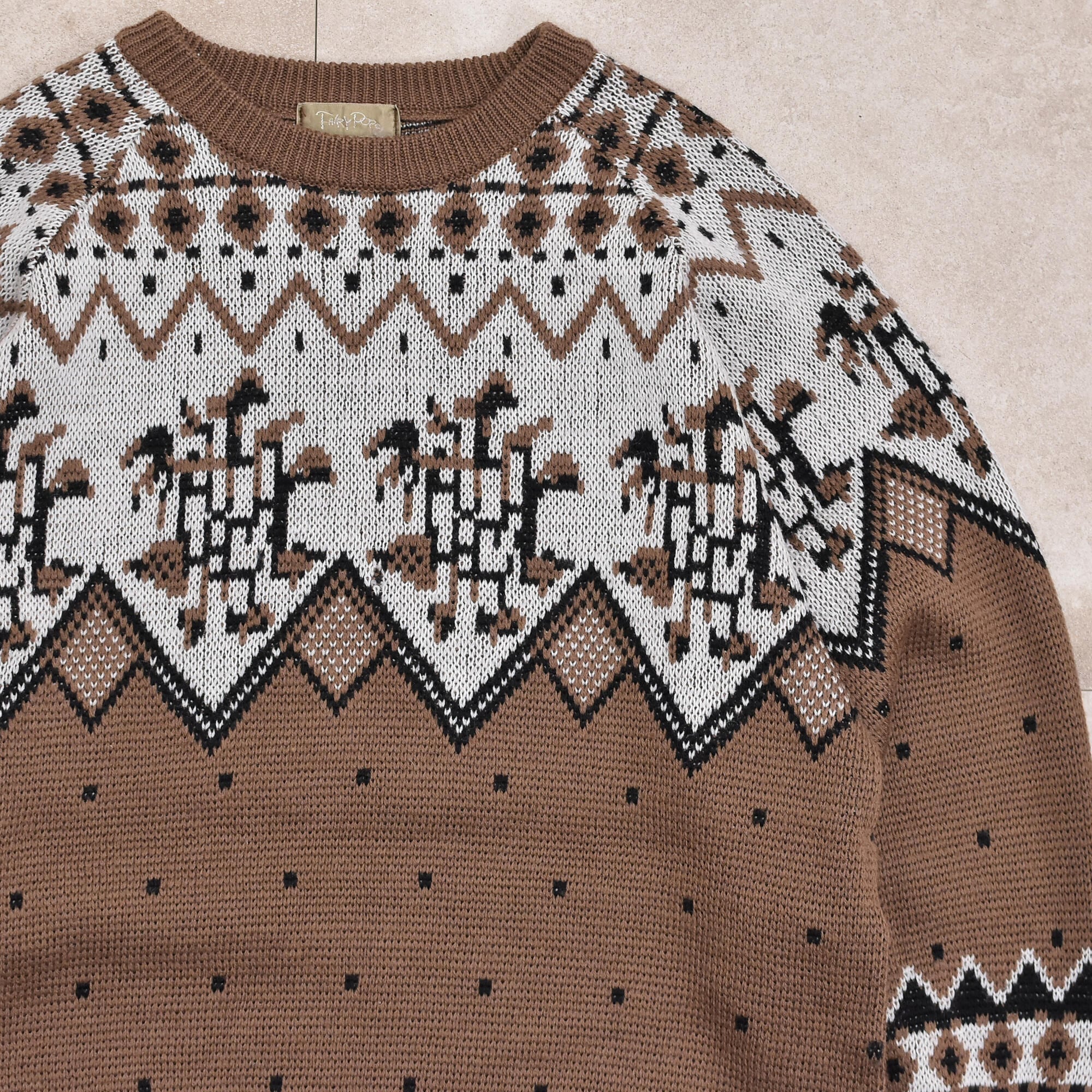 ココアブラウンの様な甘く優しいカラーをベースに、北欧のロピセーターを感じさせてくれるノルディック柄をハイゲージで丁寧に編み、デザインされたアクリルウールのセーター