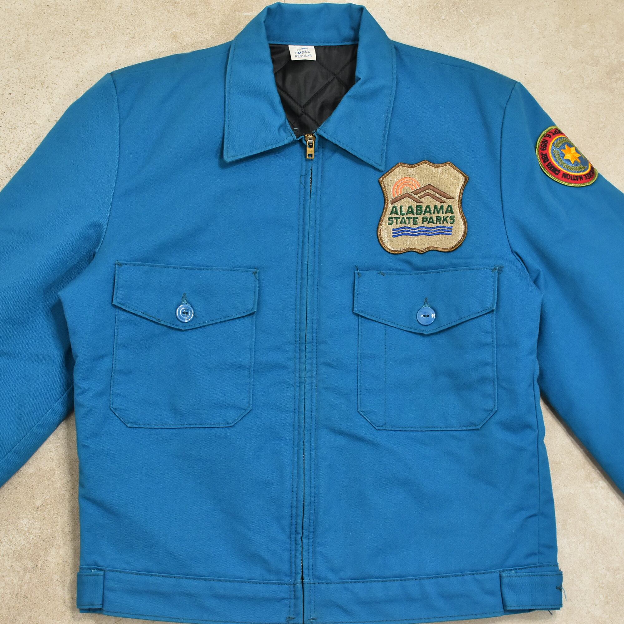 鮮やかなターコイズブルーにアラバマ州立公園とチェロキー・ネーションのワッペンが付いたレッドキャップのスタッフジャケット
