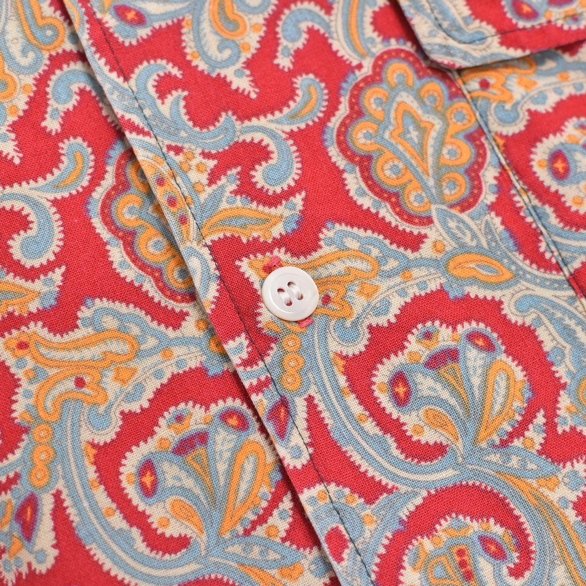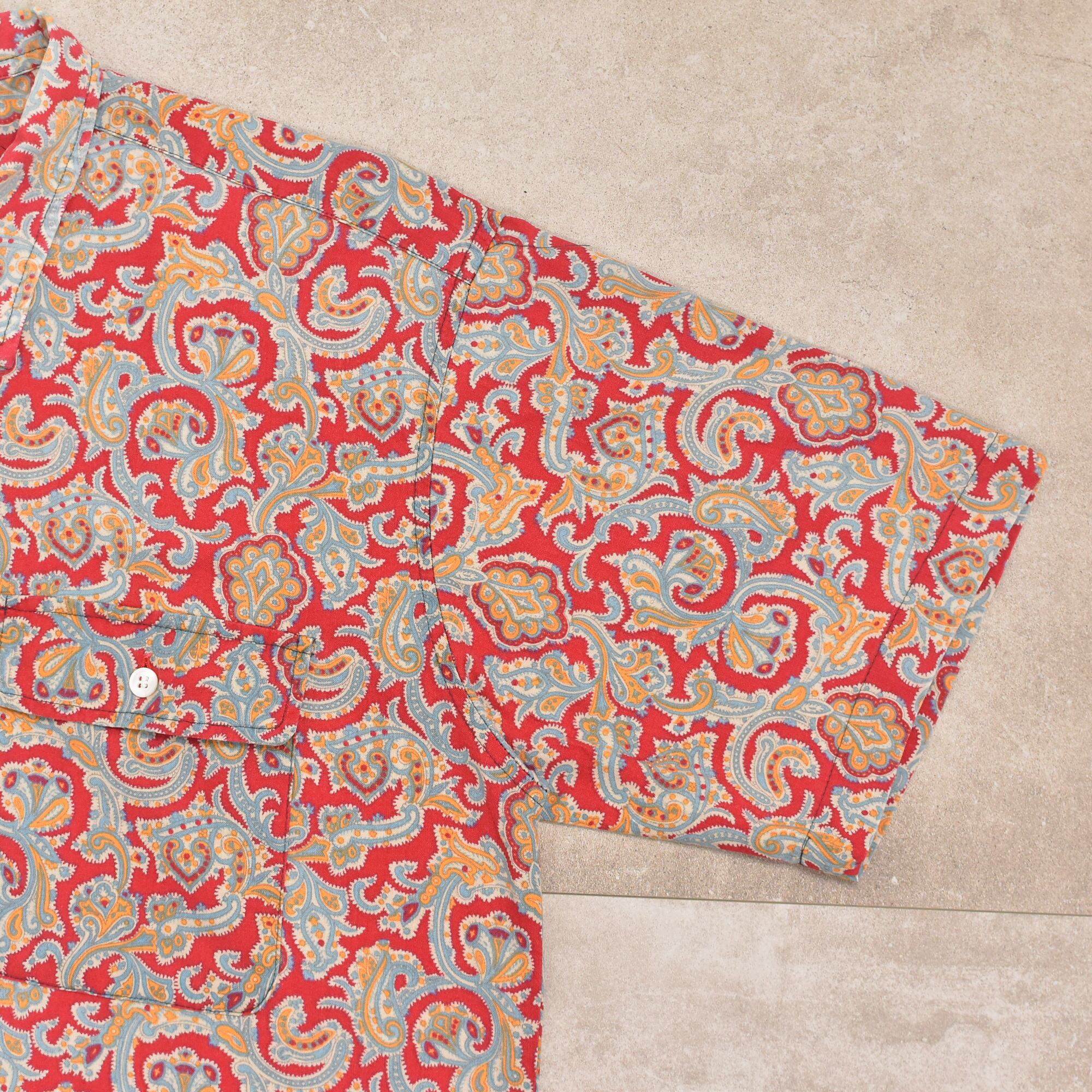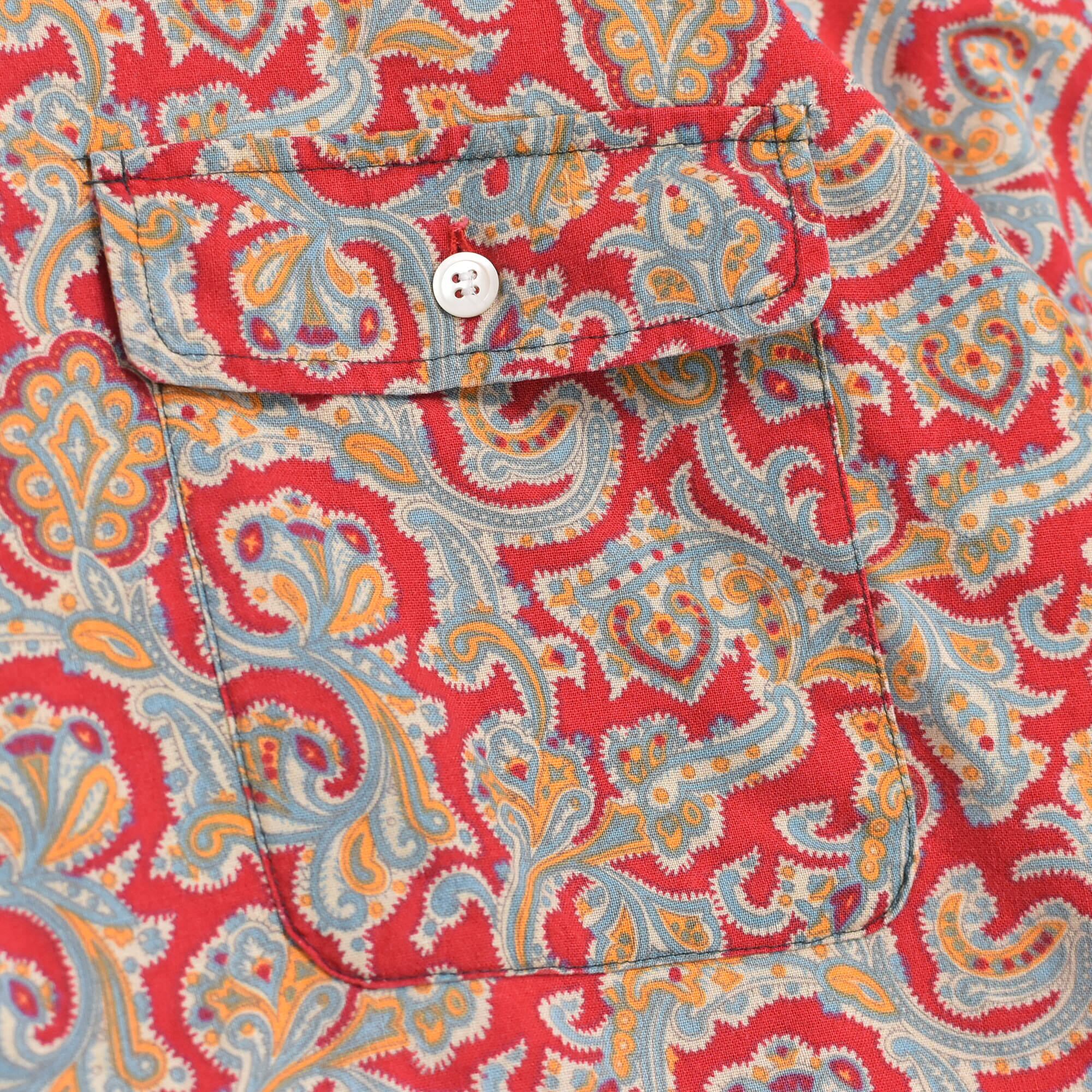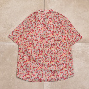 朱色のようなレッドをベースに、ペイズリー模様が総柄プリントされた半袖シャツ