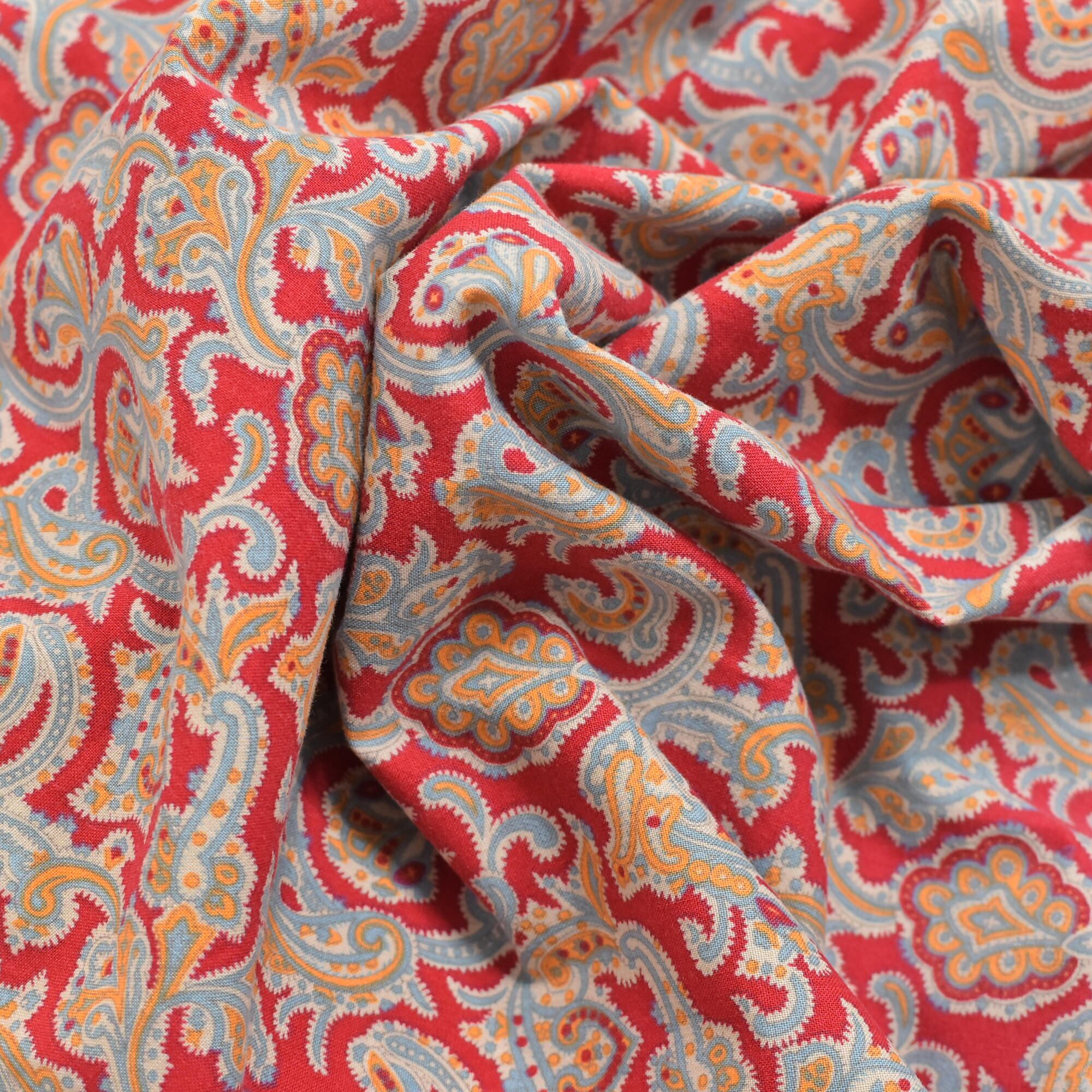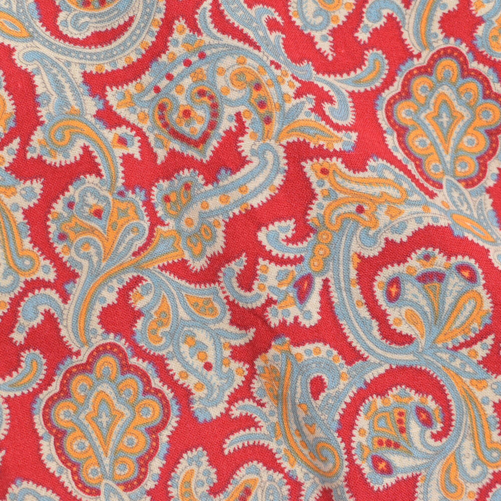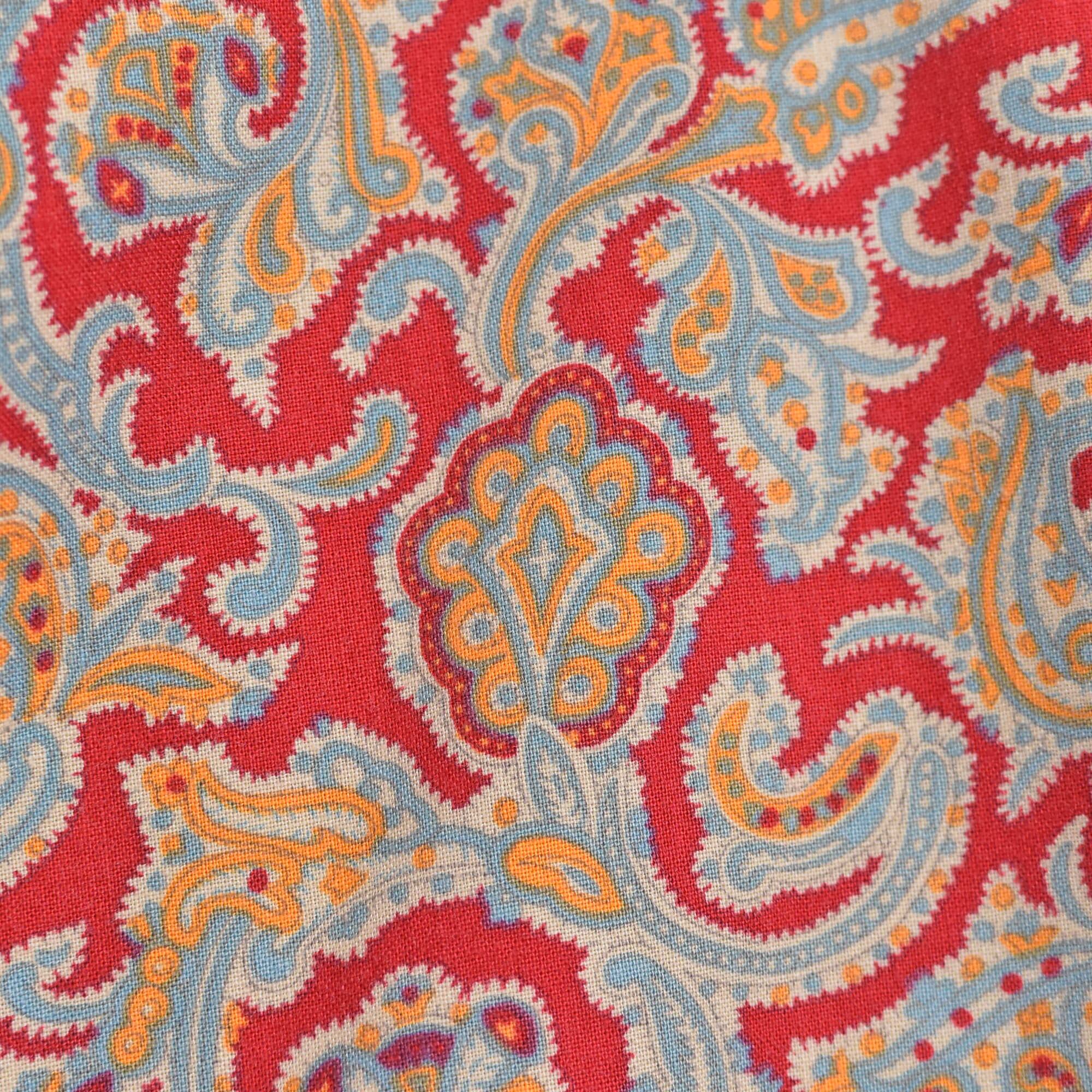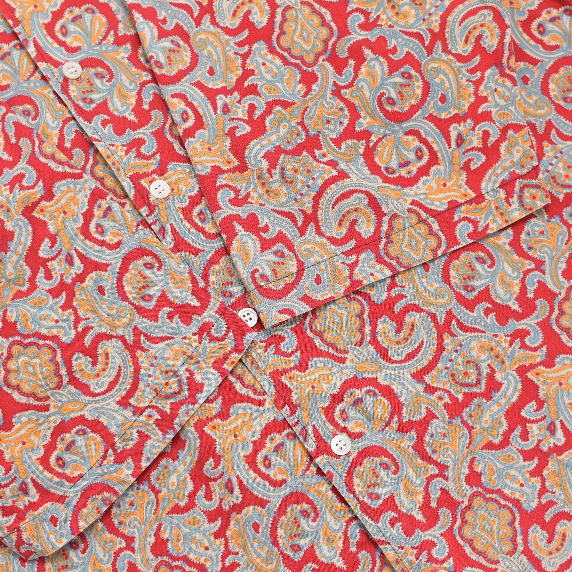 朱色のようなレッドをベースに、ペイズリー模様が総柄プリントされた半袖シャツ