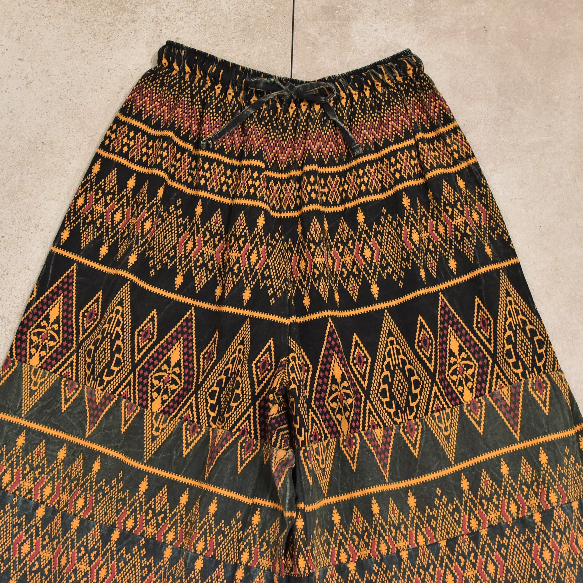 メンズ W60〜102cm ヴィンテージ モザイク柄 総柄 エスニック ティアード ガウチョパンツ 幾何学模様 ワイドパンツ Vtg ethnic tiered design gaucho pants