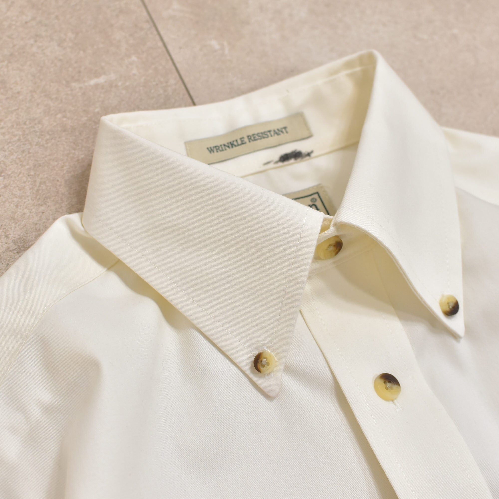 クリームに近い、オフホワイトカラーを使い、シワに強いリンクルレジスタントの防シワ加工が施されたドレスシャツ
