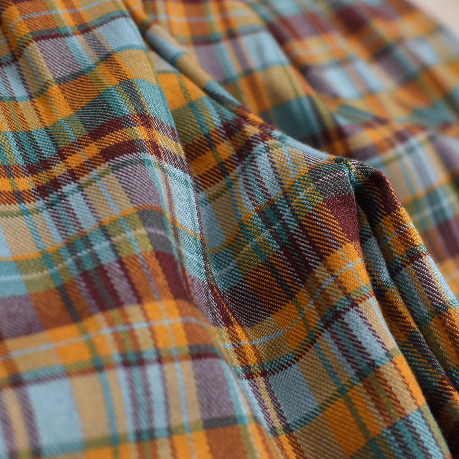 サックスブルーをベースに、ワインレッドやオレンジ、グリーンを使ったタータンチェックの様な格子柄