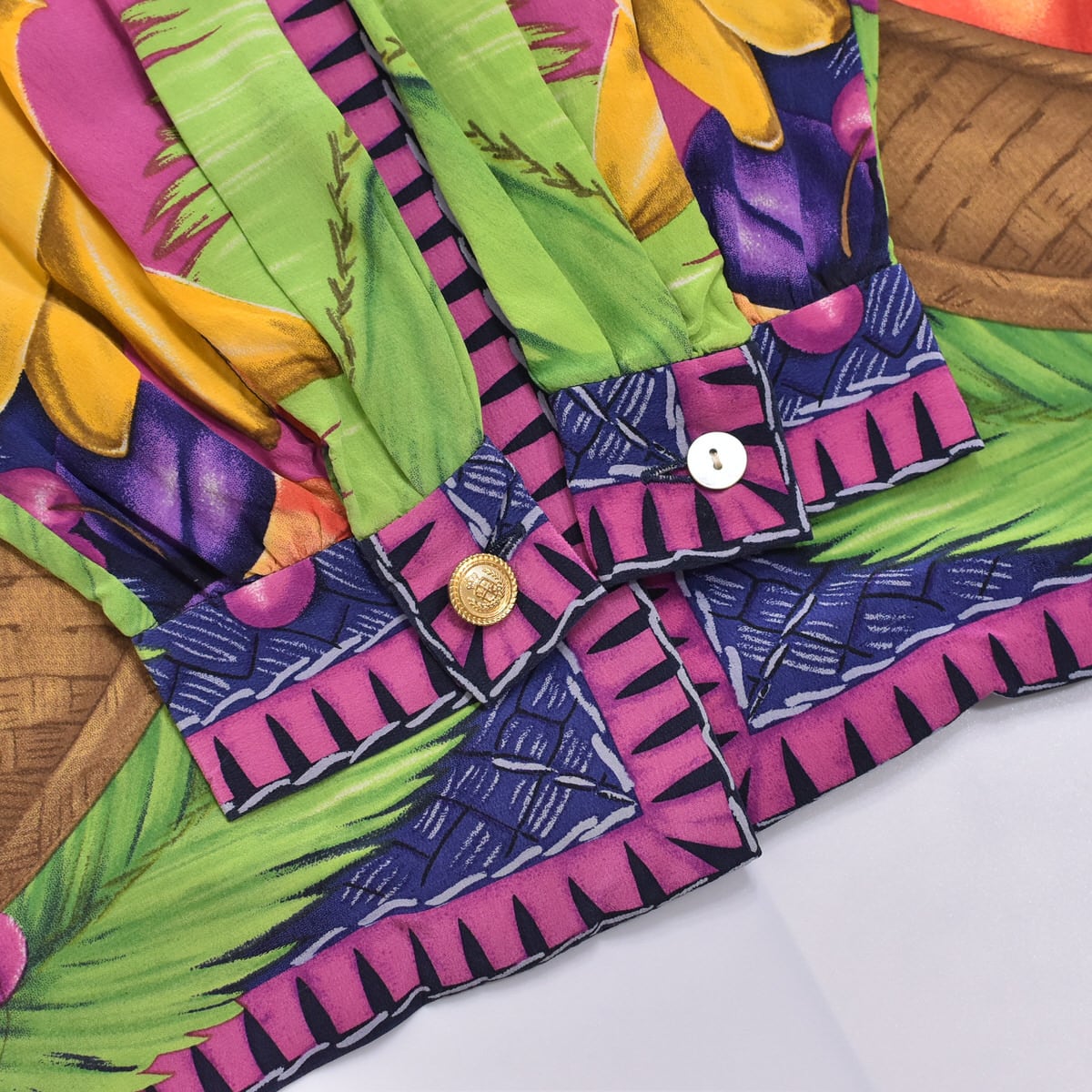 90s liz claiborne リズ・クレイボーン フルーツ柄 パネルパターン 総柄 シルクシャツ ヴィンテージ 長袖 ビンテージ 果物 レディースL~相当