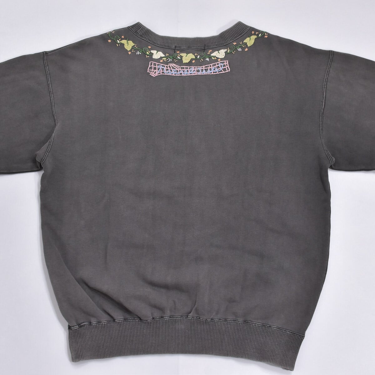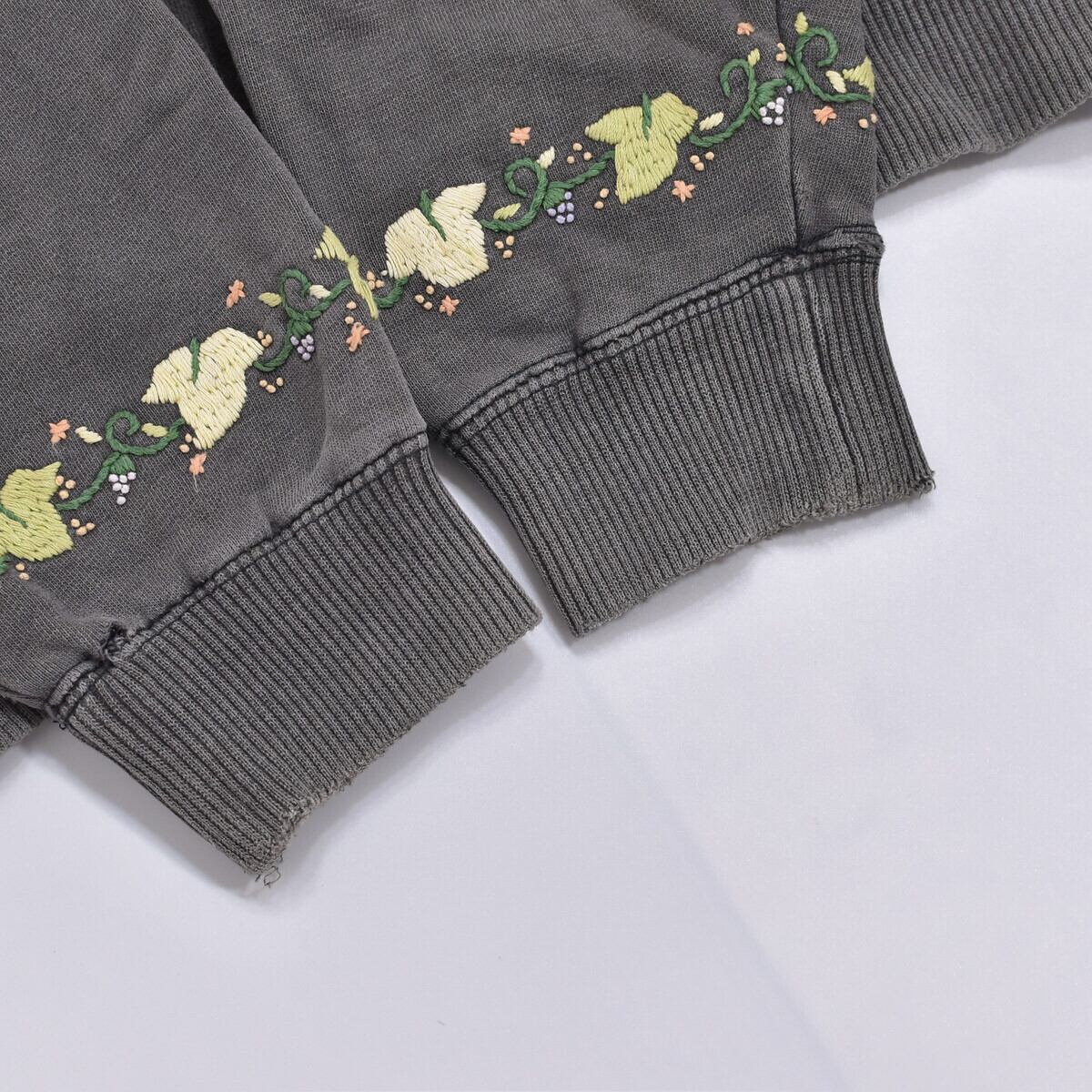 スミクロにまで色褪せたもはやグレーと言ったほうが手っ取り早いブラックのボディに、丁寧に可愛らしく、立体感のある刺繍があしらわれたスウェットシャツ
