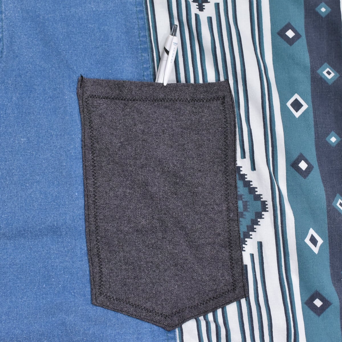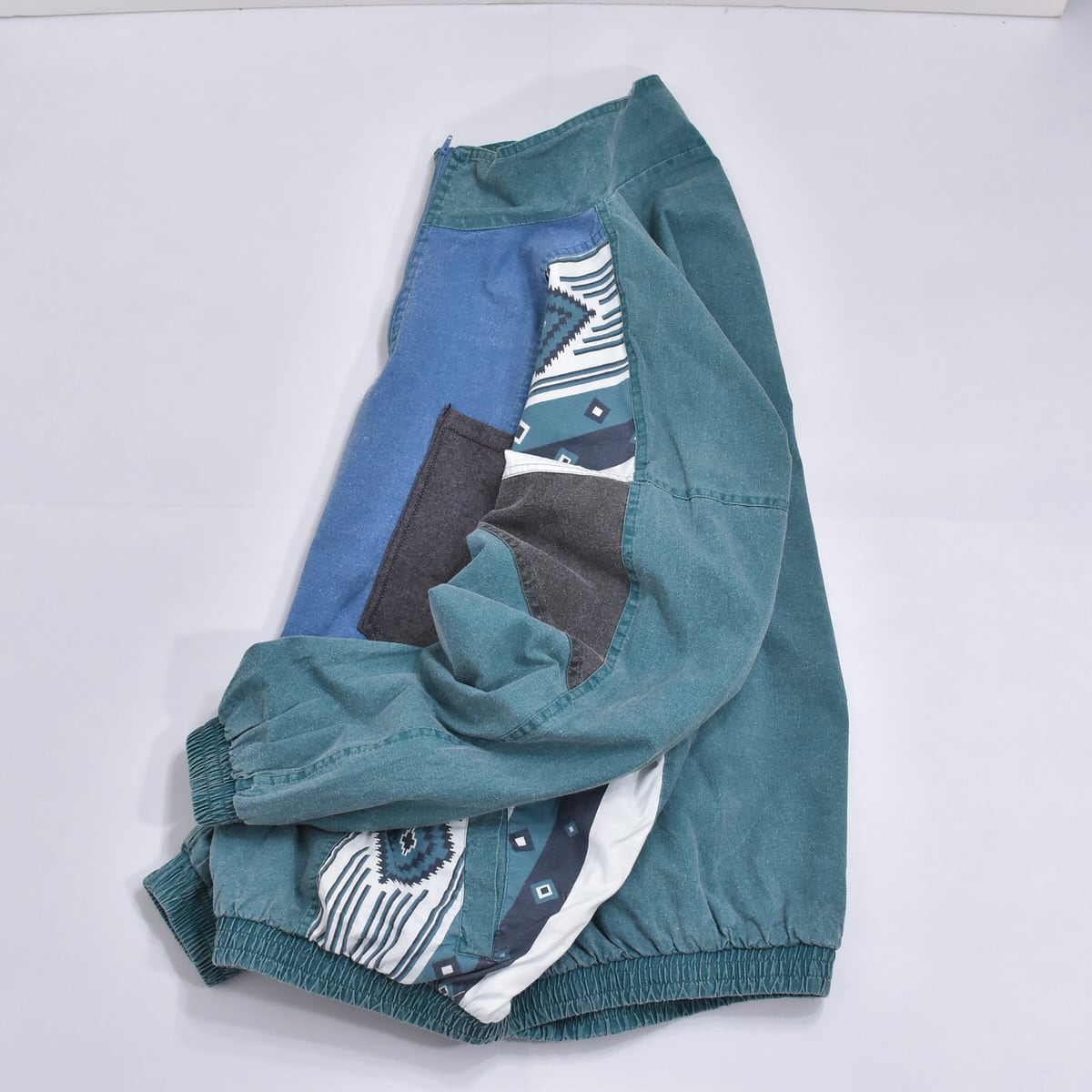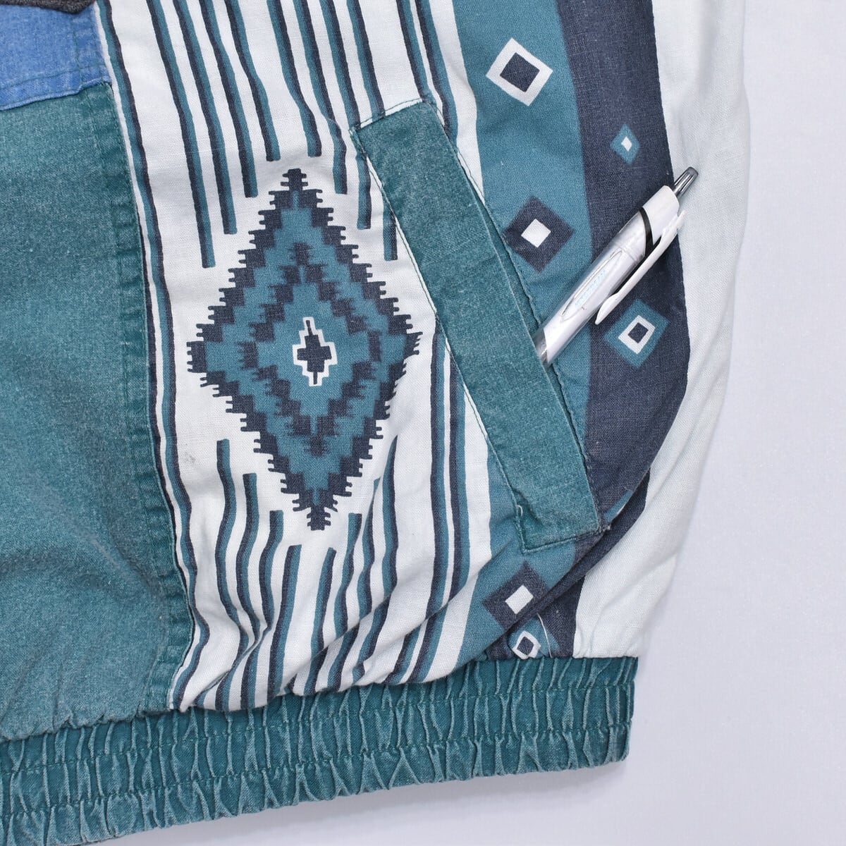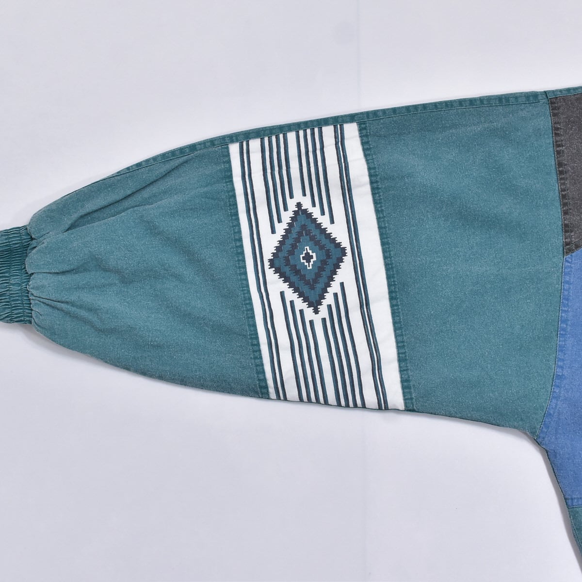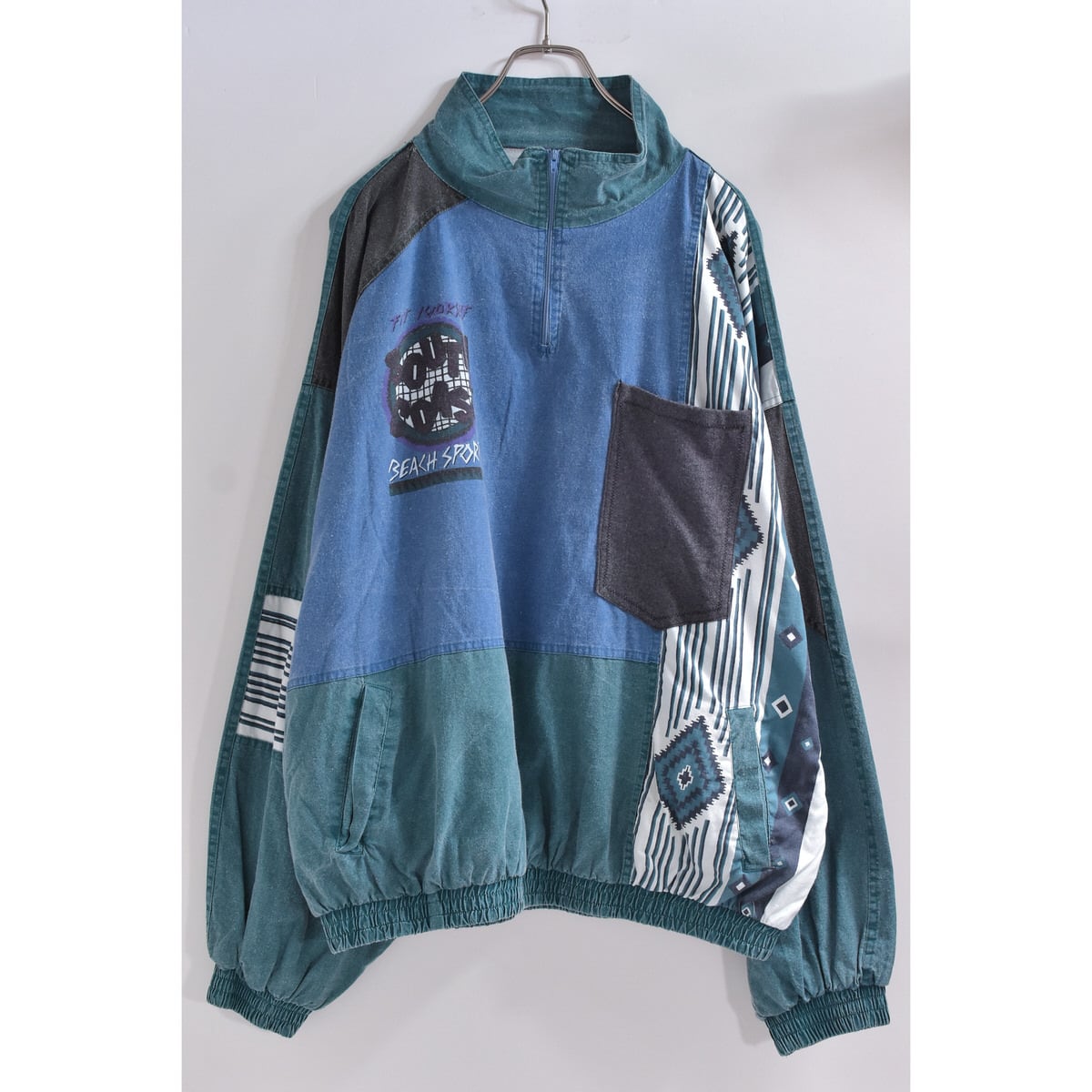 スタンドネックスタイルのハーフジップや暗めトーンのグリーンやブルー、そしてネイティブな幾何学模様の切替デザイン
