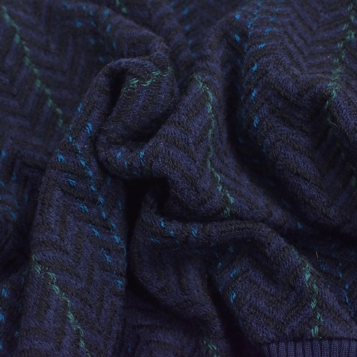 深みのあるネイビーをベースに、ほんのり凹凸感のあるヘリンボーンのジャガード織にアクセントのカラーストライプをあしらったニットブルゾン