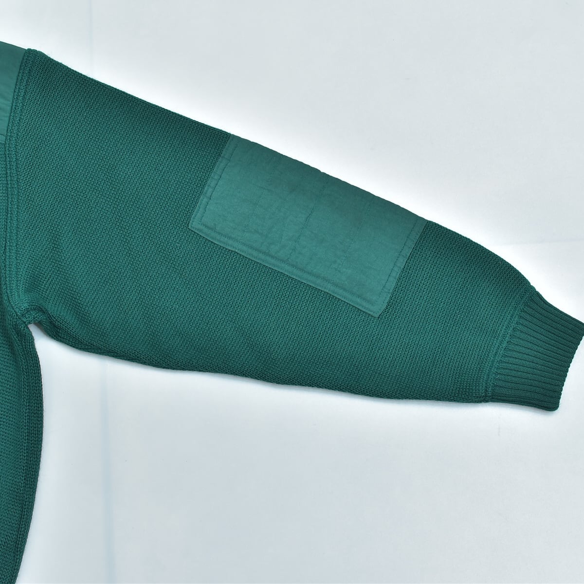 暗めトーンのブルーグリーンをベースに薄すぎず、厚すぎずのちょうど良い厚感ニット