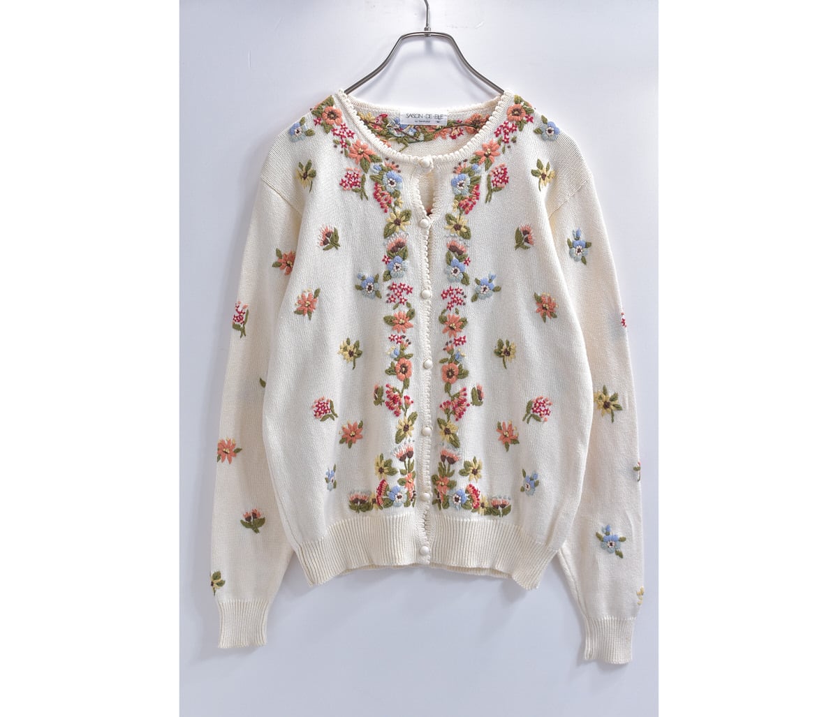 SAISON DE ELLE お花 総刺繍 デザイン コットンニット カーディガン フラワーパターン ジャパンブランド レディースMサイズ