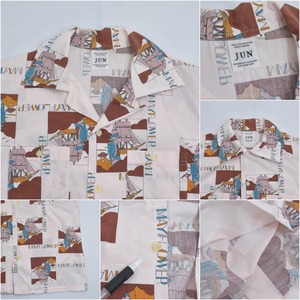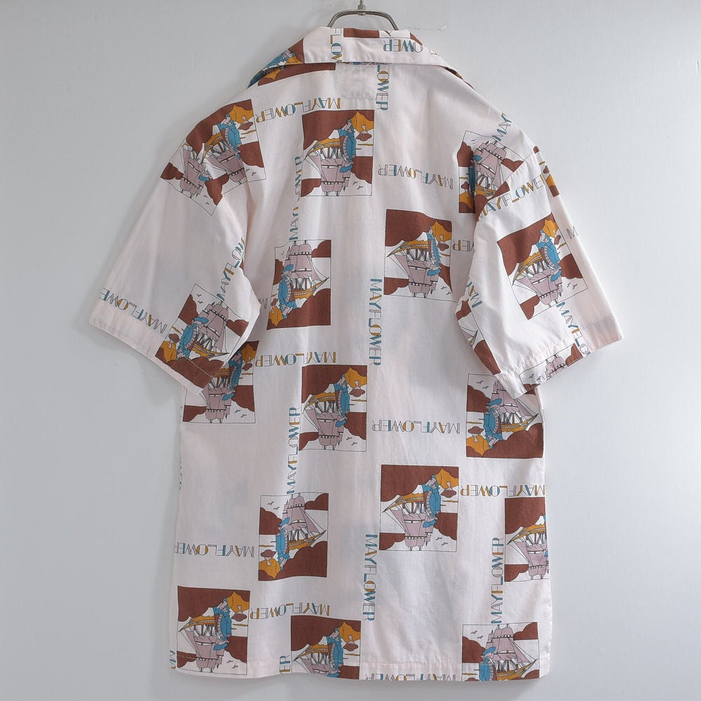 70〜80s JUN オールド・ジュン 総柄 プリント ループ留め オープンカラーシャツ ジャパンヴィンテージ 開襟 昭和レトロ ビンテージ メンズMサイズ