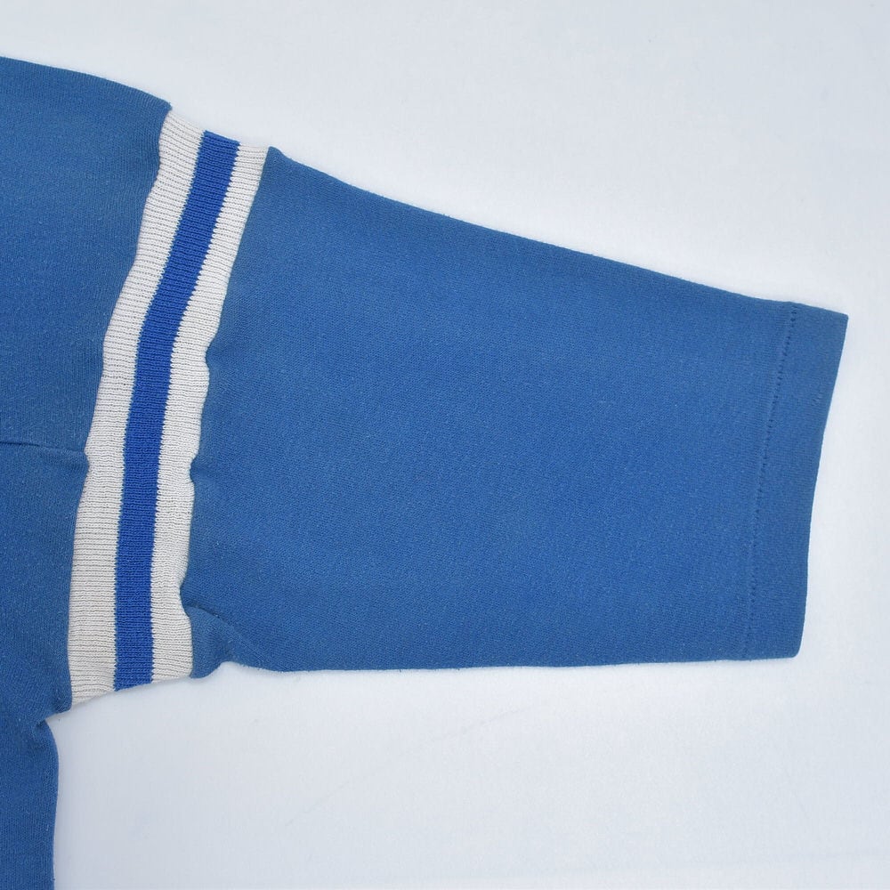 くすみブルーをベースに、フロントの大きなアーチロゴにアームホールのラインリブの切替