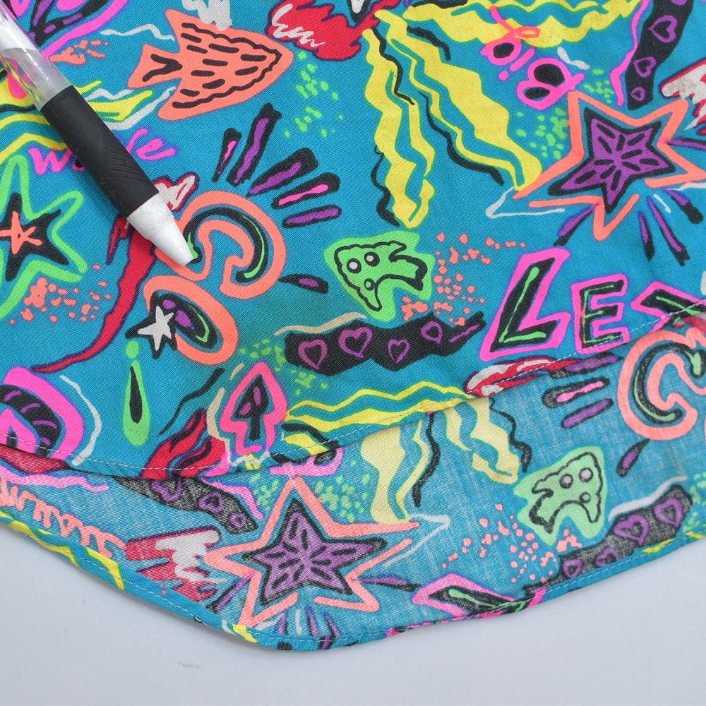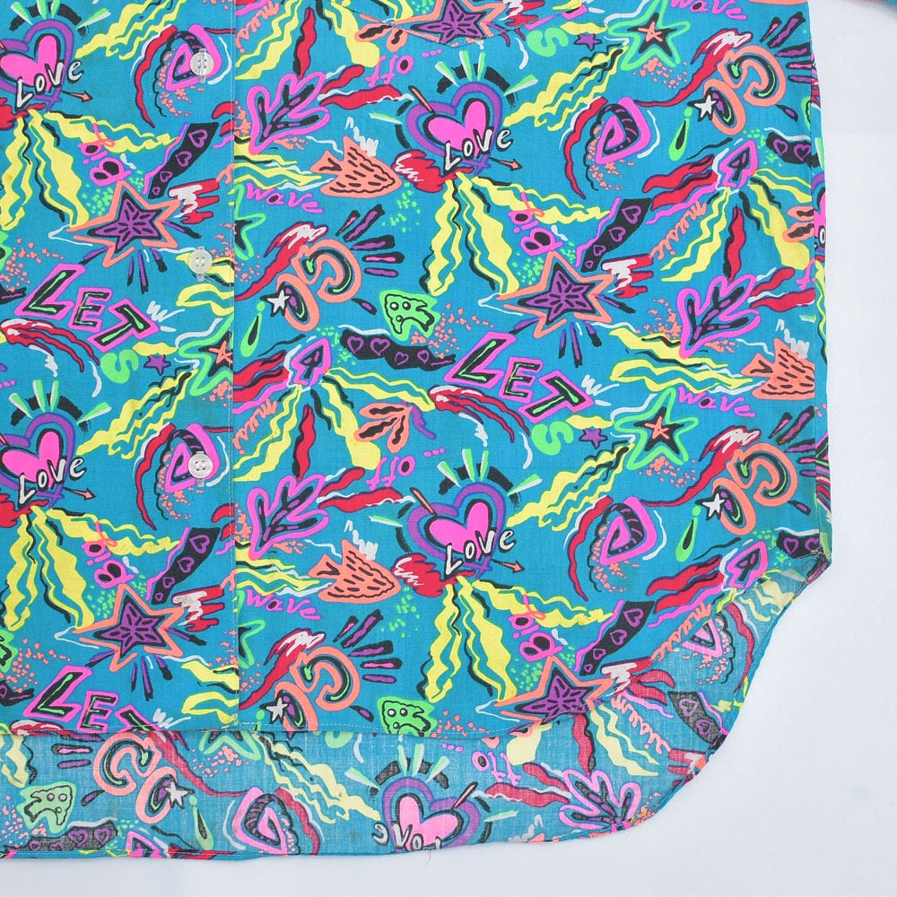 70~80s 日本製 Vintage サイケデリック ペイント風 デザイン オープンカラーシャツ ジャパンヴィンテージ 開襟 ネオンカラー ビンテージ 国産古着 レディースL~相当