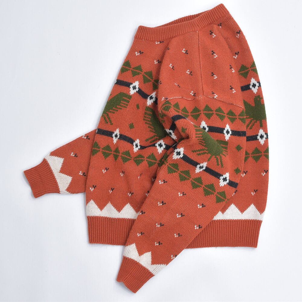 ほっこりと、温かな気持ちにさせてくれるレンガ色をベースに、ネイティブアメリカンに伝わる鳥の精霊、サンダーバードが描かれたプルオーバーニット