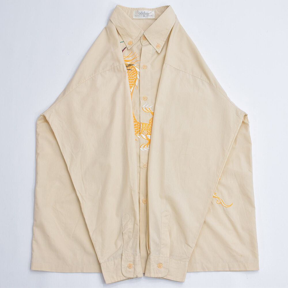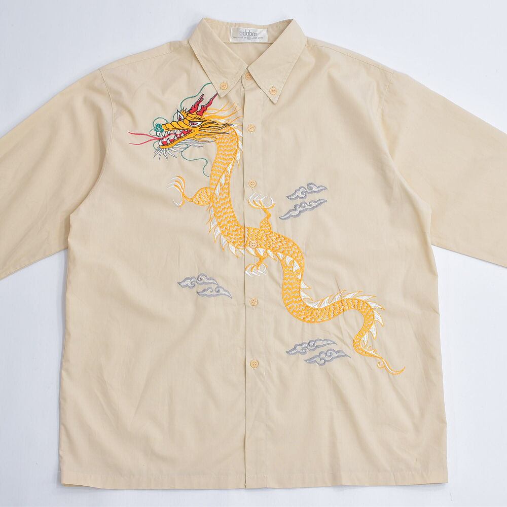 90〜00s adabat 昇り龍 ドラゴン 刺繍 デザイン ボタンダウン スカシャツ ヴィンテージ 長袖 ベージュ ビンテージ アジアン 古着 メンズL相当
