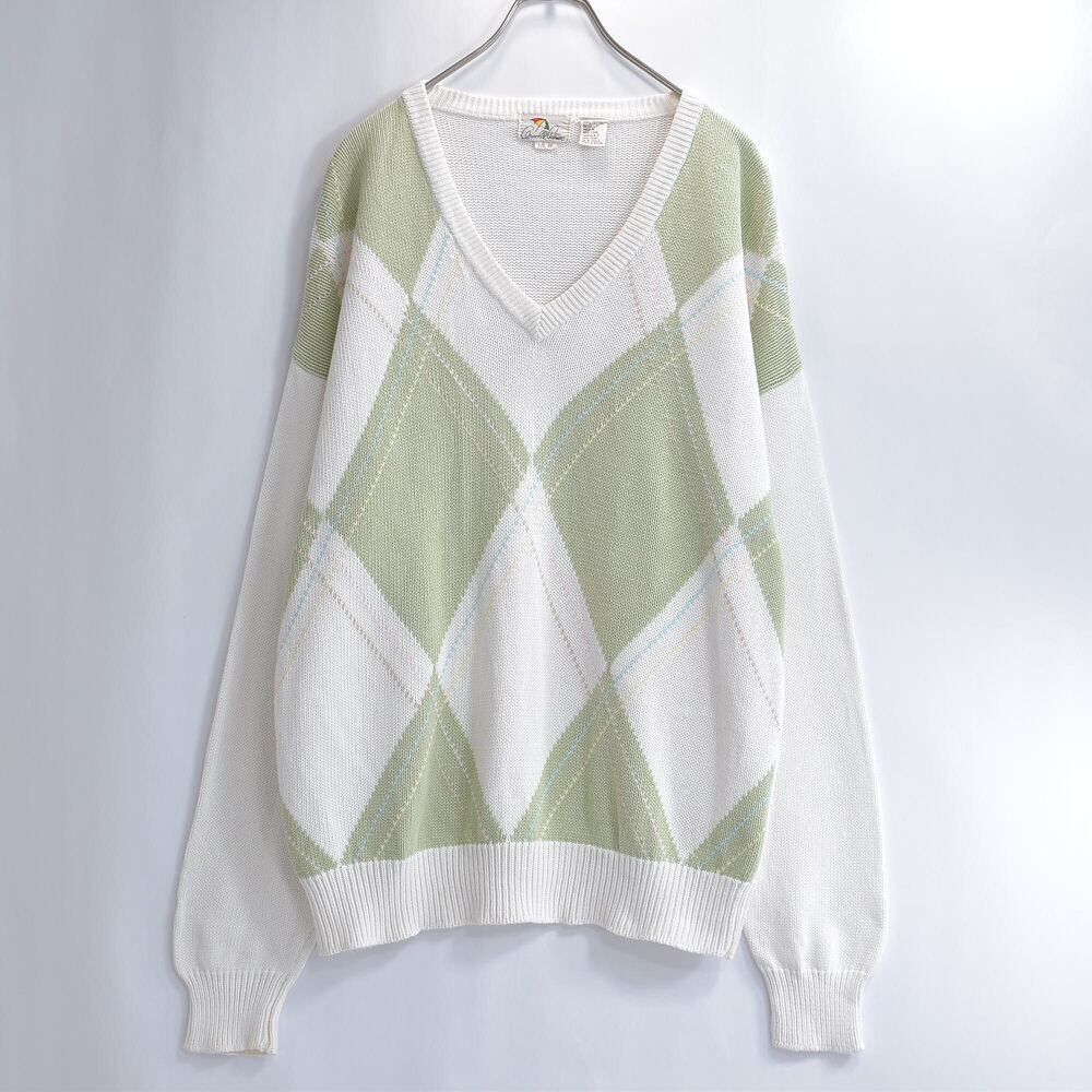 80s〜 Arnold Palmer アーノルドパーマー アーガイル柄 コットン Vネック ニット プルオーバー セーター ヴィンテージ ビンテージ 古着 メンズ Lサイズ