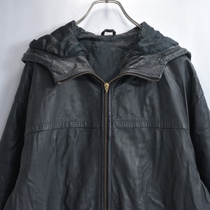 Used 90s〜 ブラックレザー コート フード一体型 本革 ヴィンテージ 革ジャン アウター ジャンパー ビンテージ 裏地付き レザージャケット 古着 メンズL相当