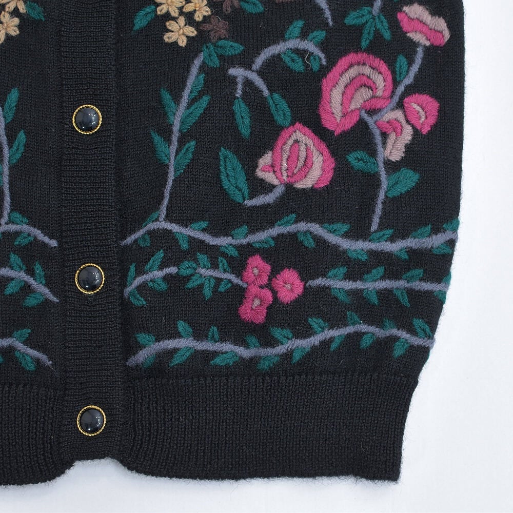 80~90s Pavone フラワー刺繍デザイン ウールニット カーディガン ジャパンヴィンテージ セーター ニット 花柄 ブラック ビンテージ 古着 レディースL相当