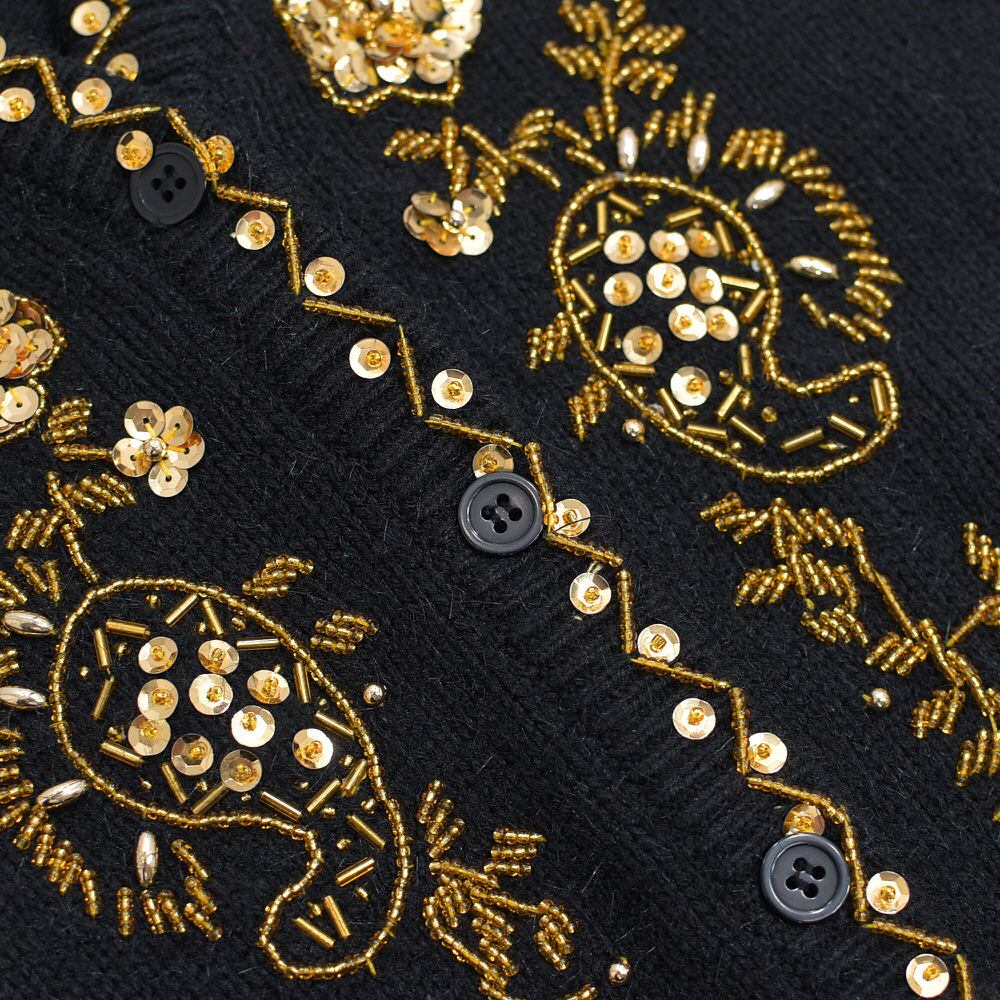 ブラックベースのアクリルとナイロンの混紡ニットをベースに、ビーズやスパンコールで前立てや身頃に丁寧に刺繍にてデザイン