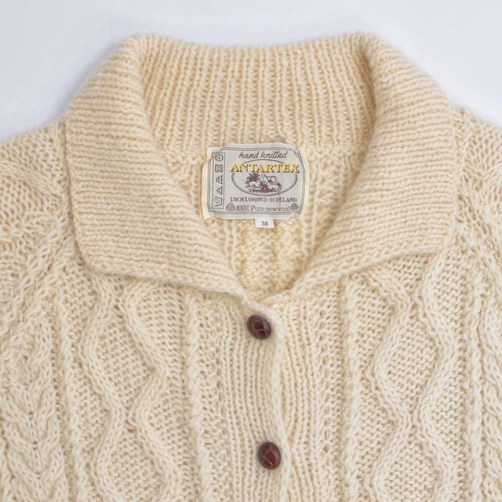 70〜80s スコットランド製 ANTARTEX アラン ニット カーディガン フィッシャーマンセーター ヴィンテージ アイボリー 北欧 ビンテージ ヨーロッパ古着 レディースXL相当