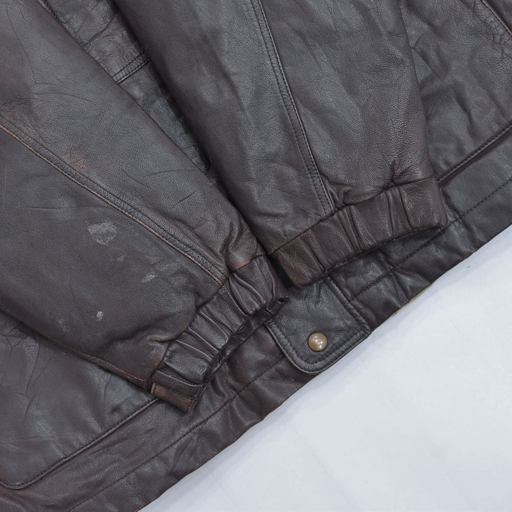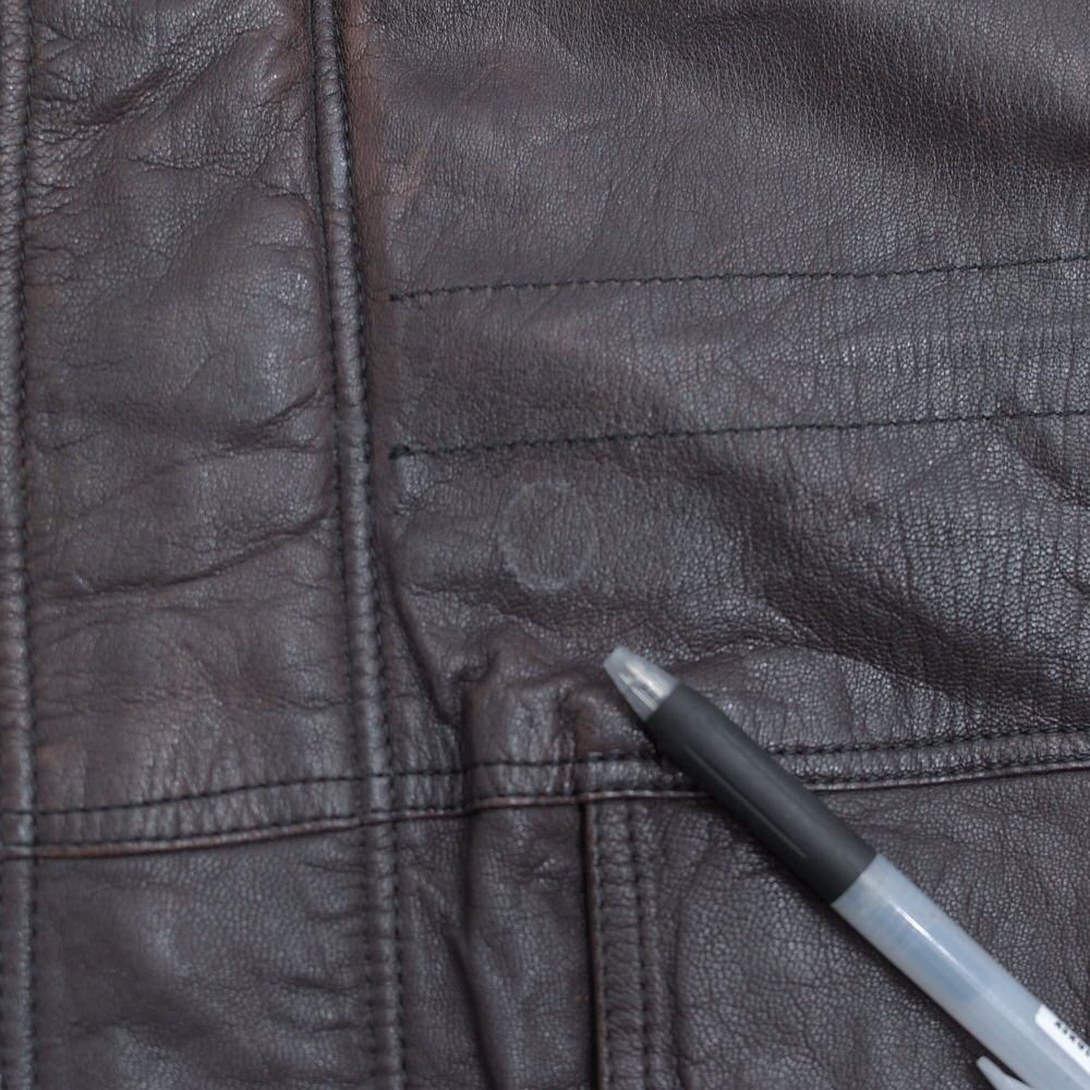 ・使用感や革特有のシワや経年による擦れキズや小さな汚れや色褪せ、画像のようにフロント腹部付近、右袖口、左袖ひじ付近、内側裏地に汚れありますがその他目立つ汚れ、ダメージは見当たらず、日常的に古着を着用されている方であれば問題無く着用いただけると思います