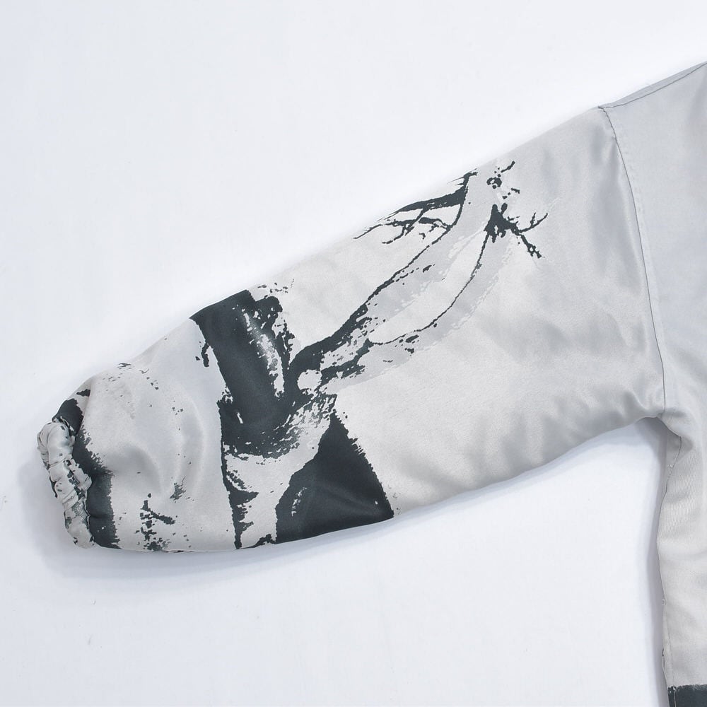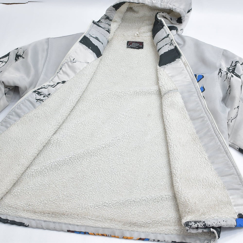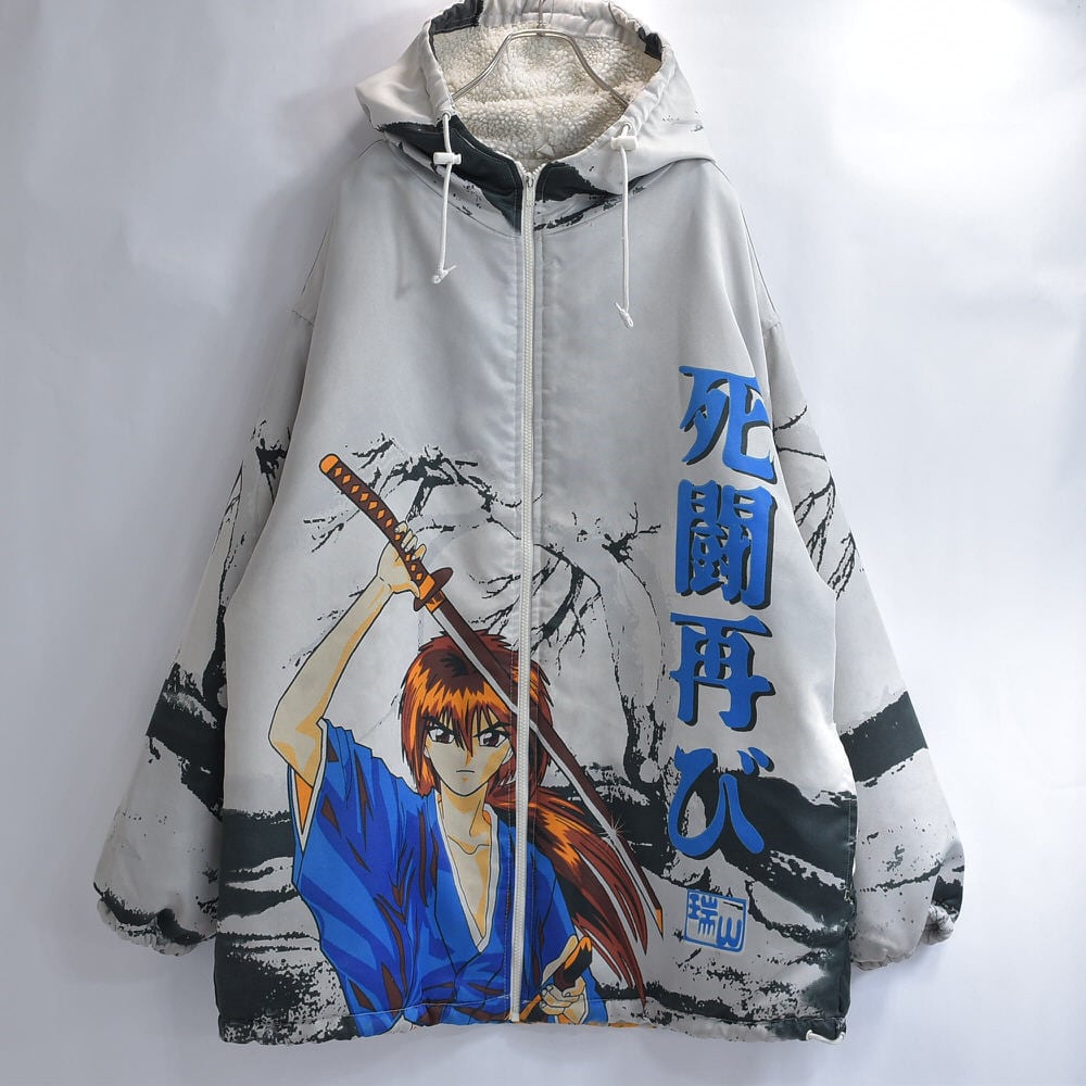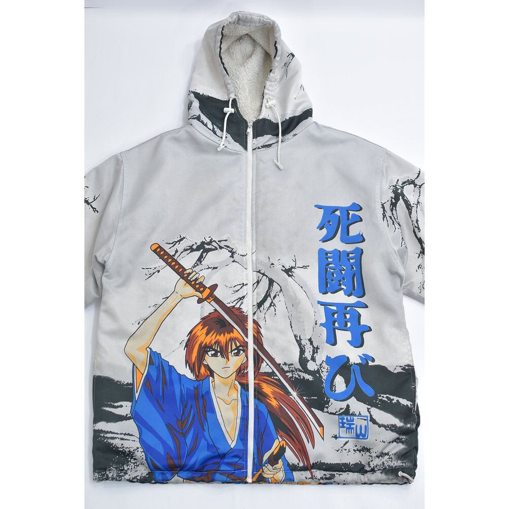 90s~ るろうに剣心 全面 プリントフード付き ボアジャケット 総柄 ZAM Urban Wear ヴィンテージ グレー アウター コート 少年ジャンプ 漫画 アニメ ビンテージ USA アメリカ古着 メンズXLサイズ