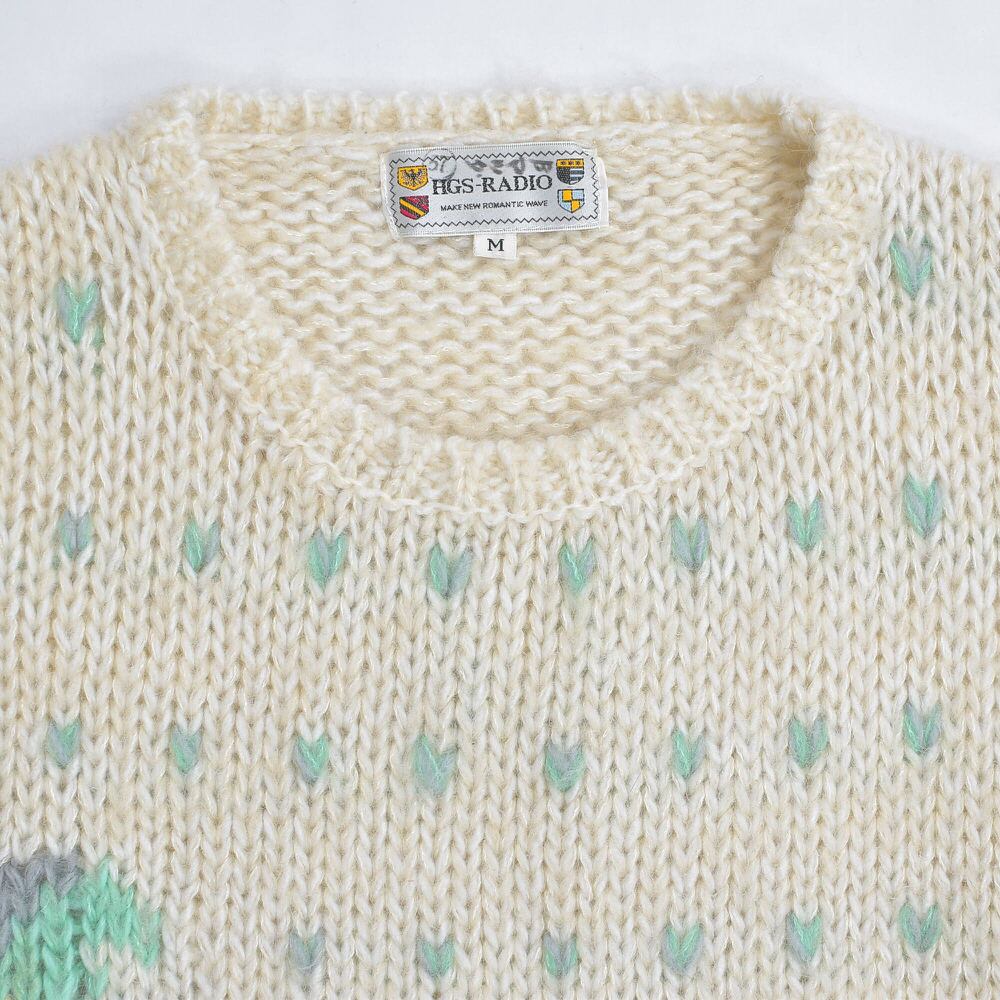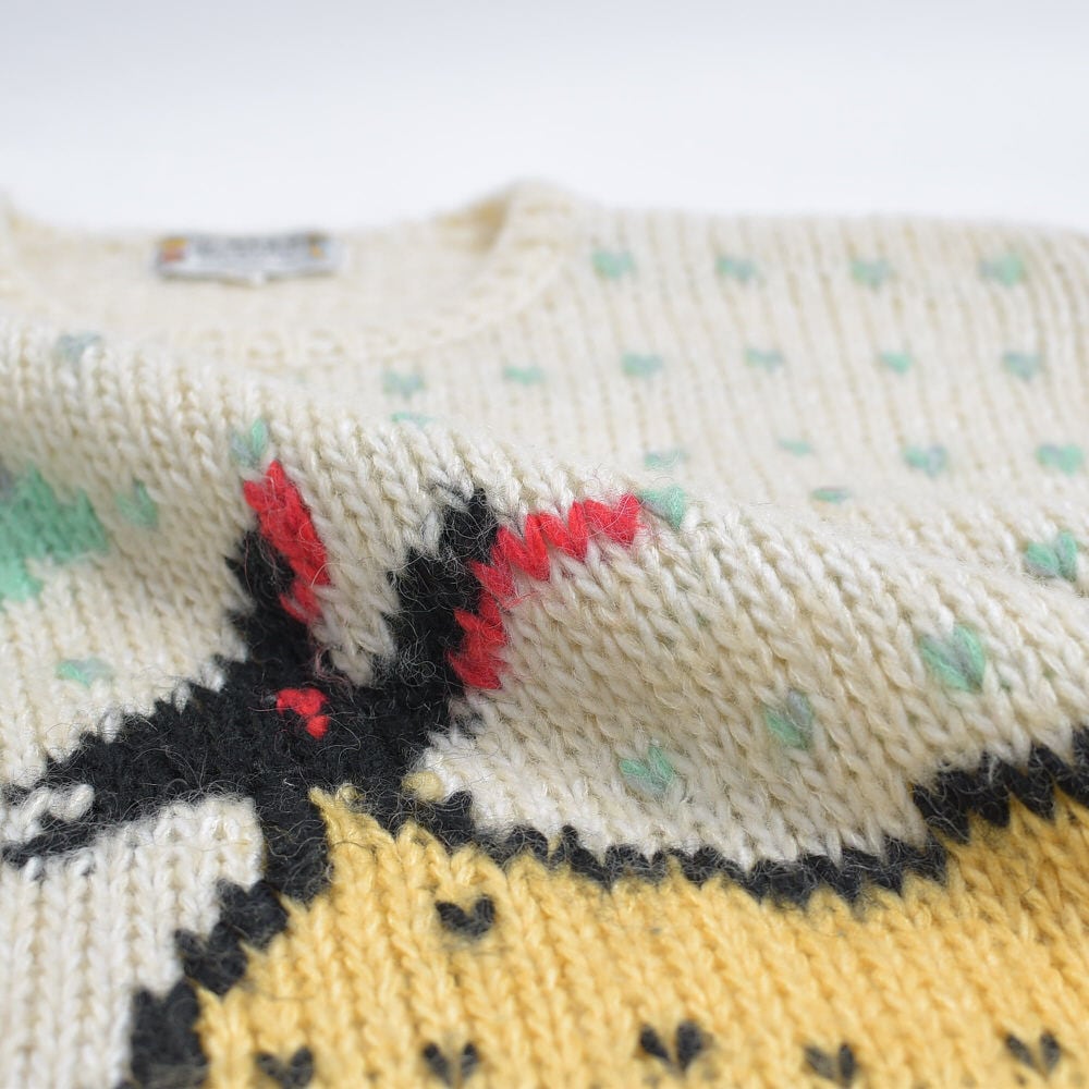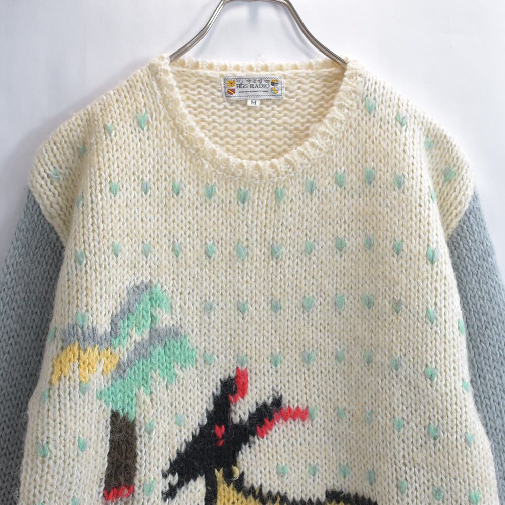 80〜90s HGS-RADIO エスニック調 アニマル柄 プルオーバーニット ジャパンヴィンテージ バーズアイ セーター オフホワイト グレー ビンテージ 古着 レディースL〜XL相当