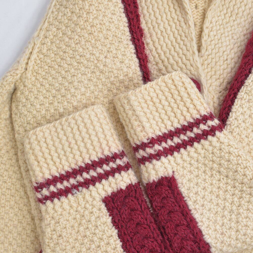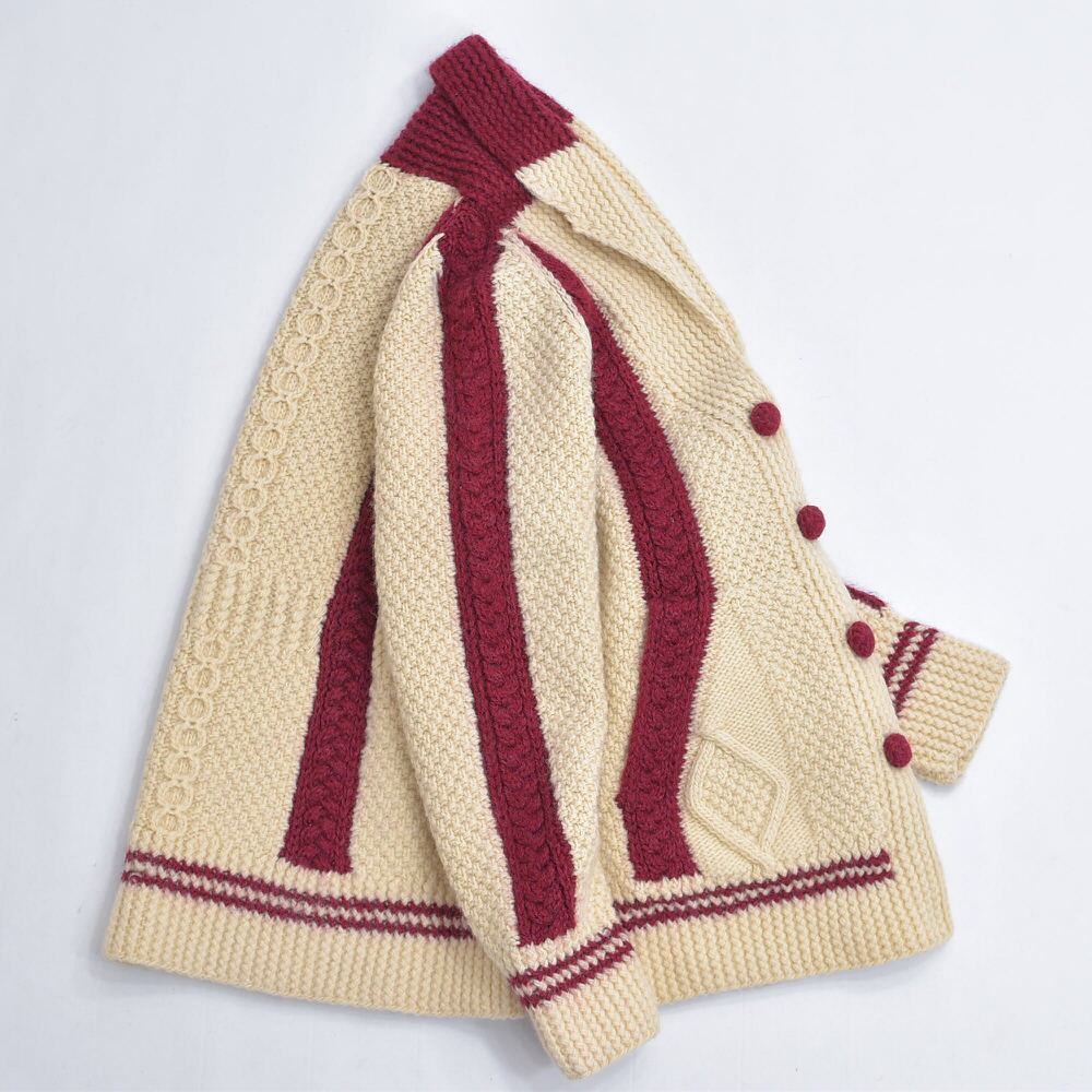 優しさを感じるアイボリーをベースに、襟や袖などにアクセントを加えたワインレッドの差し色からはチルデンニットなエッセンスも感じるプレップな一枚