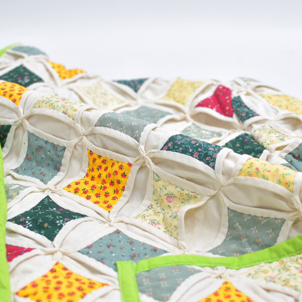 一つ一つの生地を、一つ一つ丁寧にスクエア状のパーツに形造り、それをコツコツと繋ぎ合わせて一つの生地に仕上げる