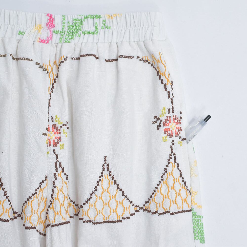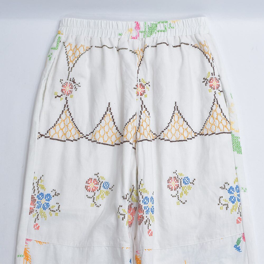 Remakeリメイク 再構築 パッチワーク&フラワー刺繍 デザイン ルーズシルエット コットン イージーパンツ エシカル ホワイト 古着 裏地付き レディースW69〜104cm