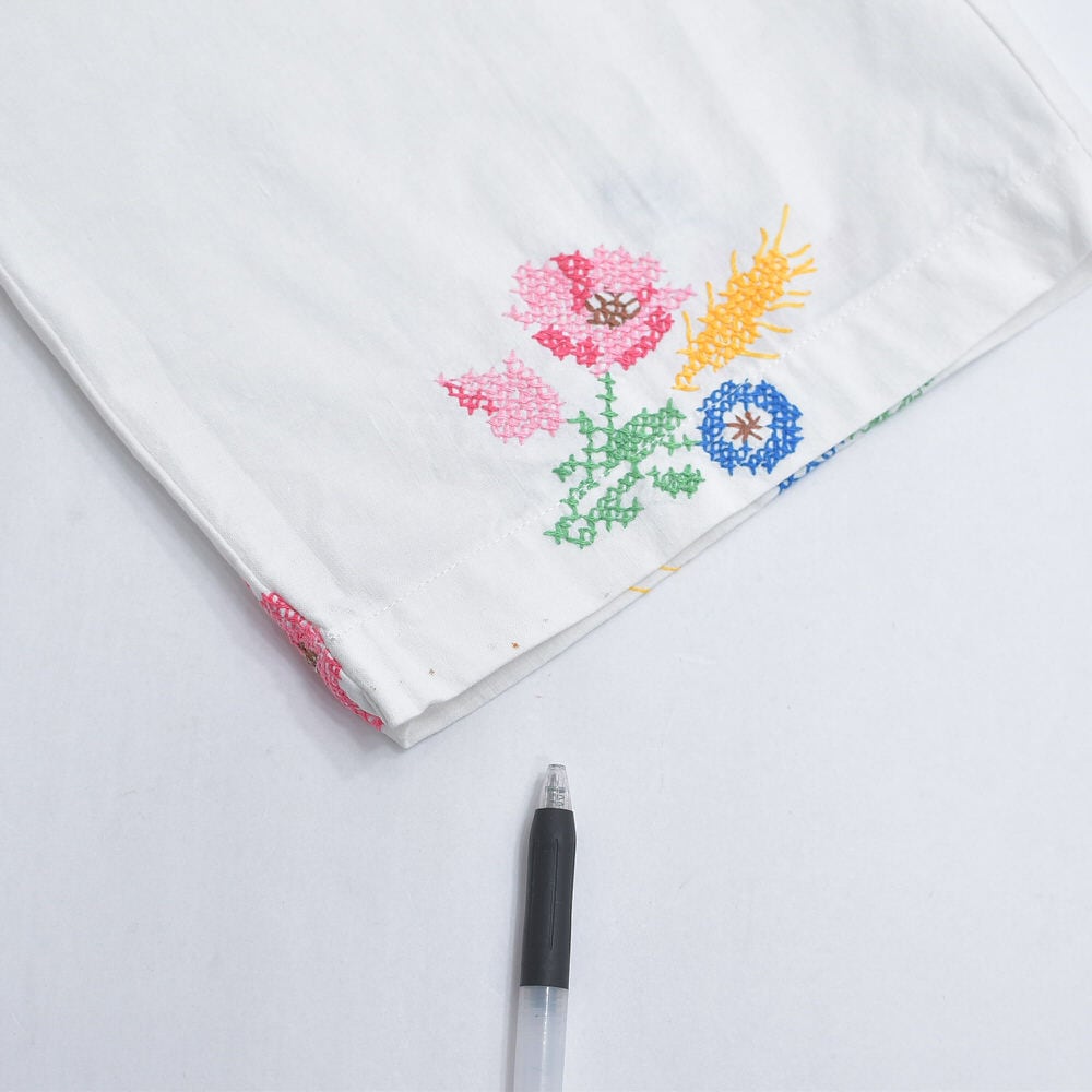 Remakeリメイク 再構築 パッチワーク&フラワー刺繍 デザイン ルーズシルエット コットン イージーパンツ エシカル ホワイト 古着 裏地付き レディースW69~104cm